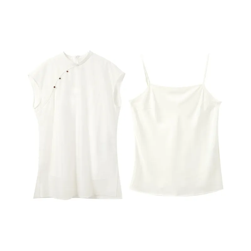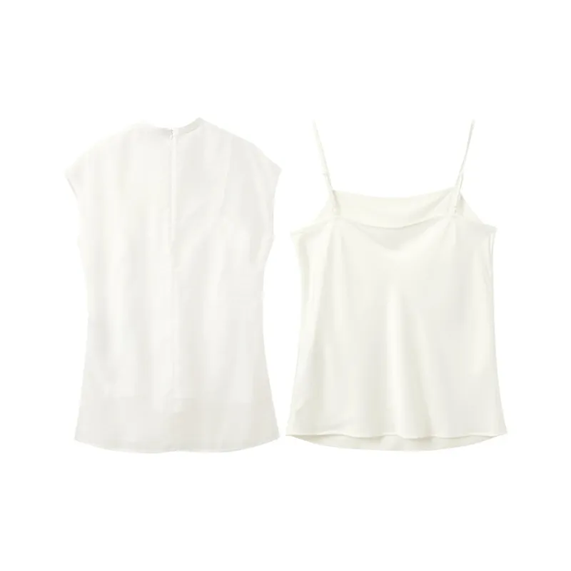 3COLOUR 의류 세트 펄 화이트 블라우스 + 캐미솔 여성 캐주얼 슈트