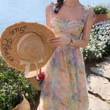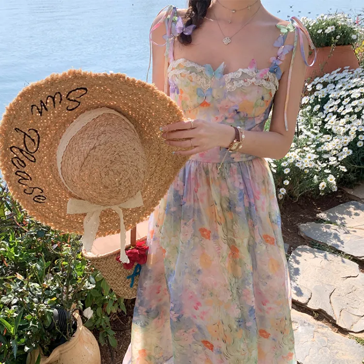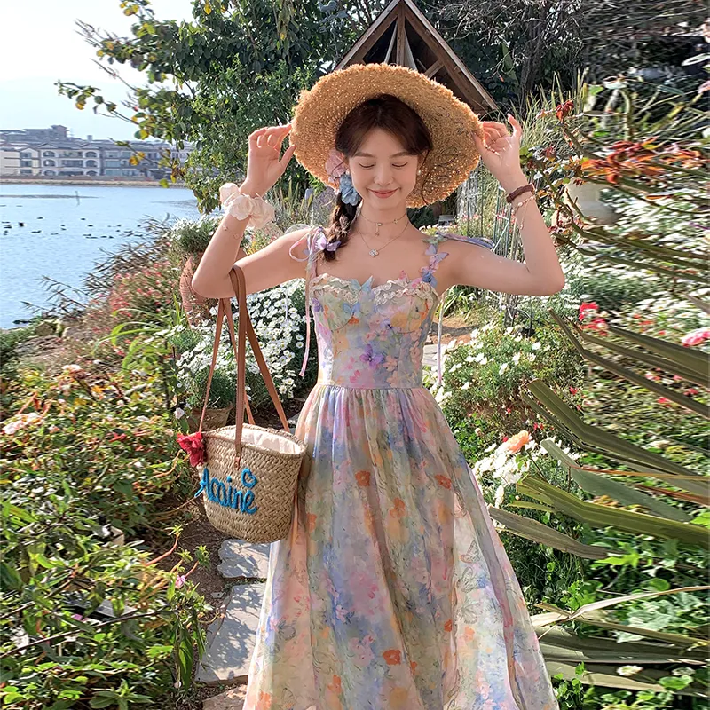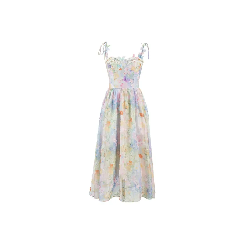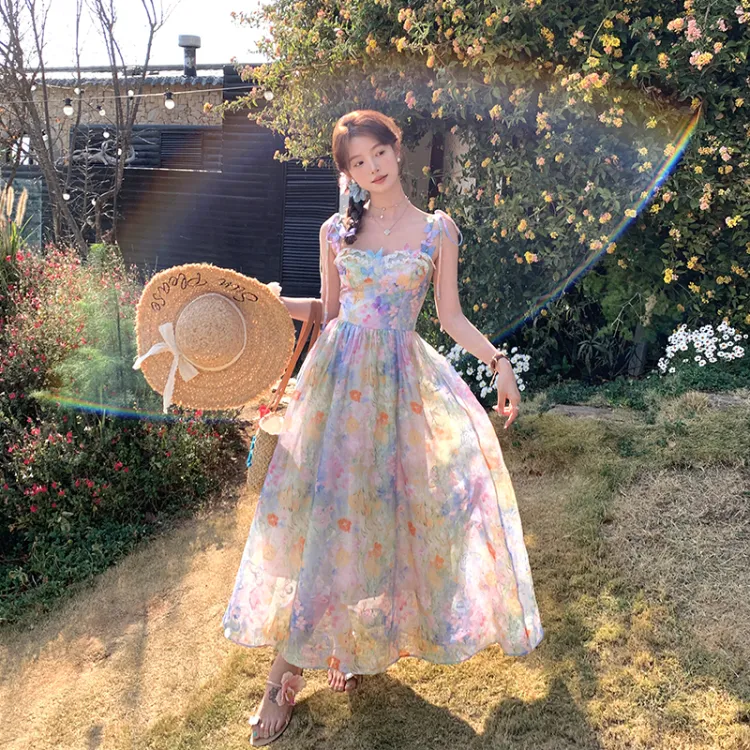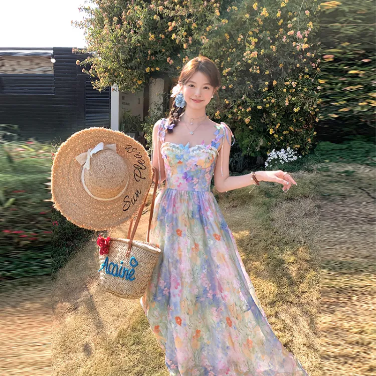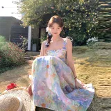 ACAINES 오일 페인팅 핑크 블루 여성 슬립 원피스 - POIZON