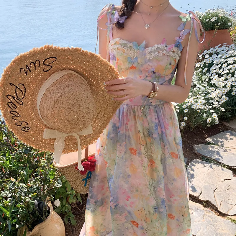 ACAINES 오일 페인팅 핑크 블루 여성 슬립 원피스