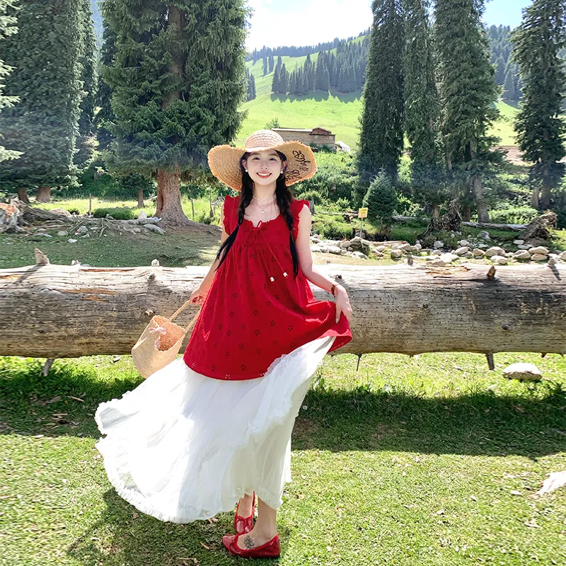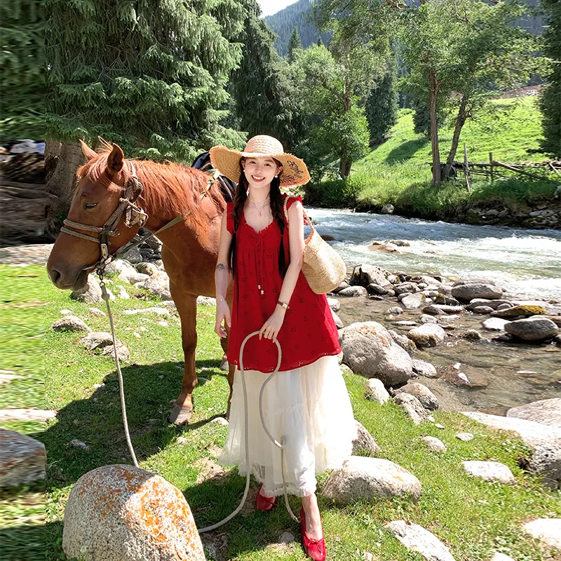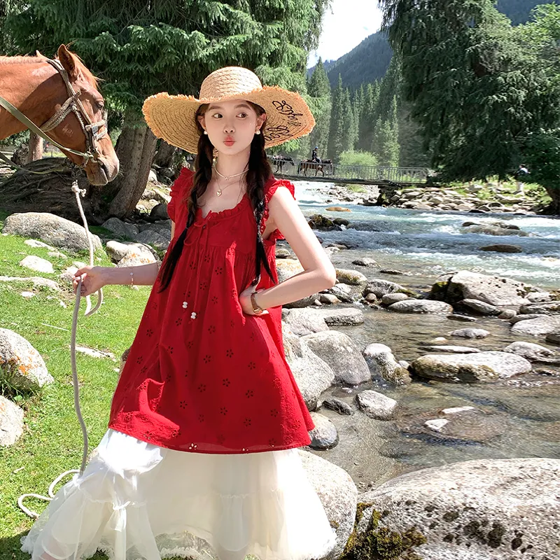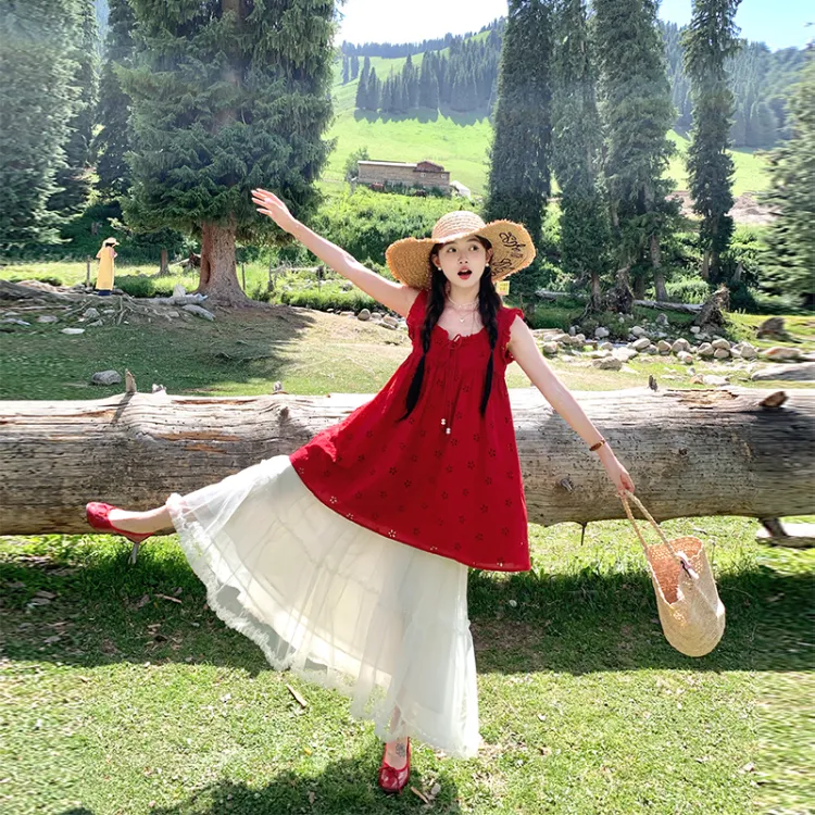 ACAINES 빈티지 레드 의류 세트 여성 투피스 스커트 세트 - POIZON