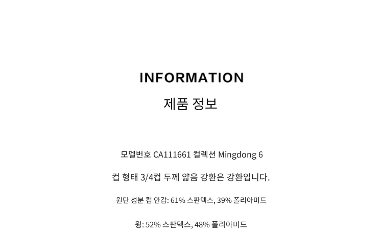 컵 안감: 61% 스판덱스, 39% 폴리아미드 측면 날개 소재: 52% 스판덱스, 48% 폴리아미드