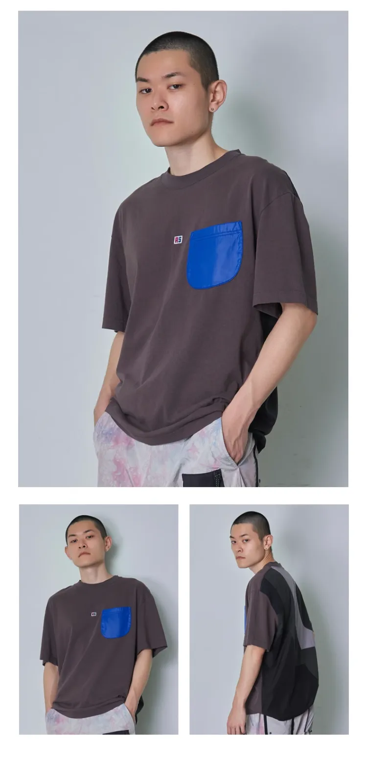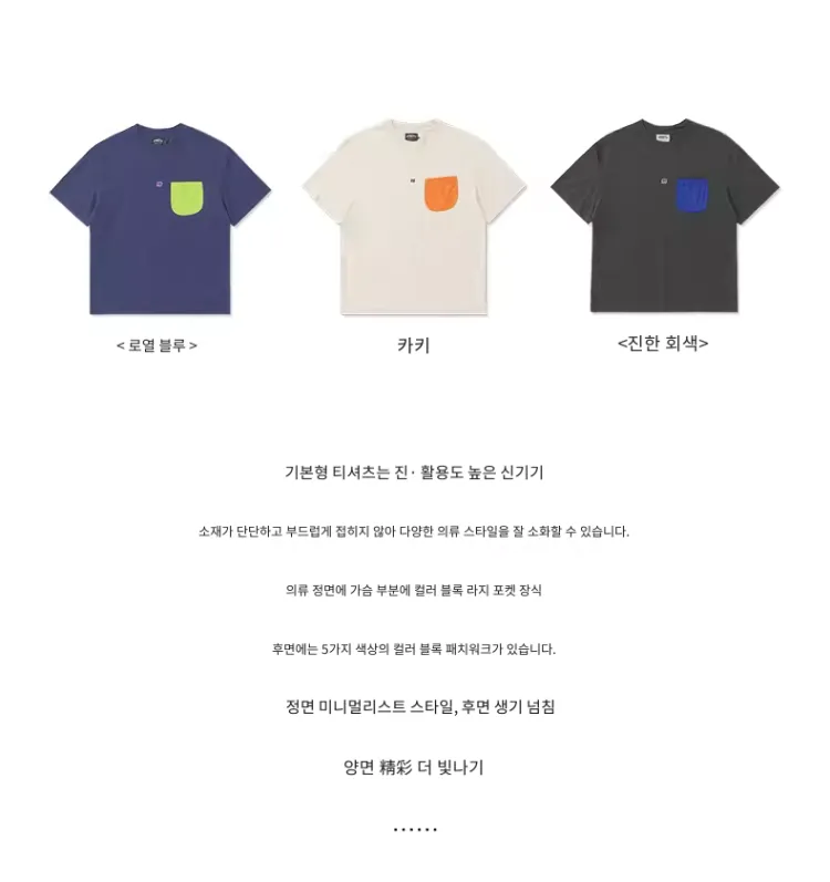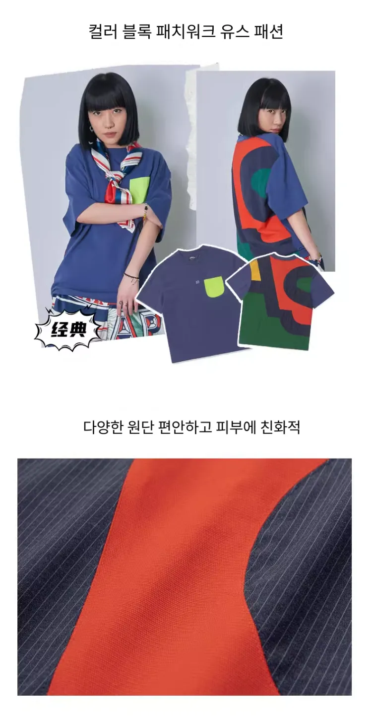 원단: 100% 순면 배색 원단 A: 60% 폴리에스테르, 40% 폴리아미드 배색 원단 B: 69% 폴리에스테르, 29% 비스코스, 2% 엘라스테인