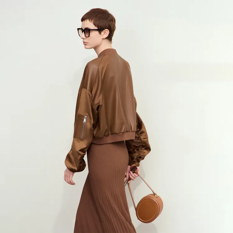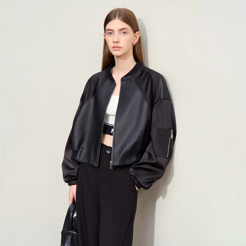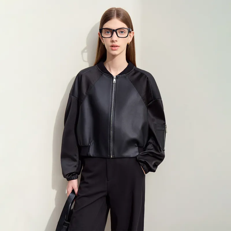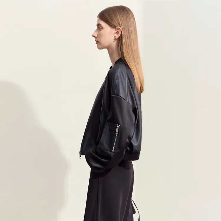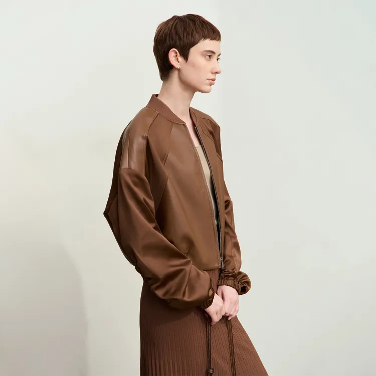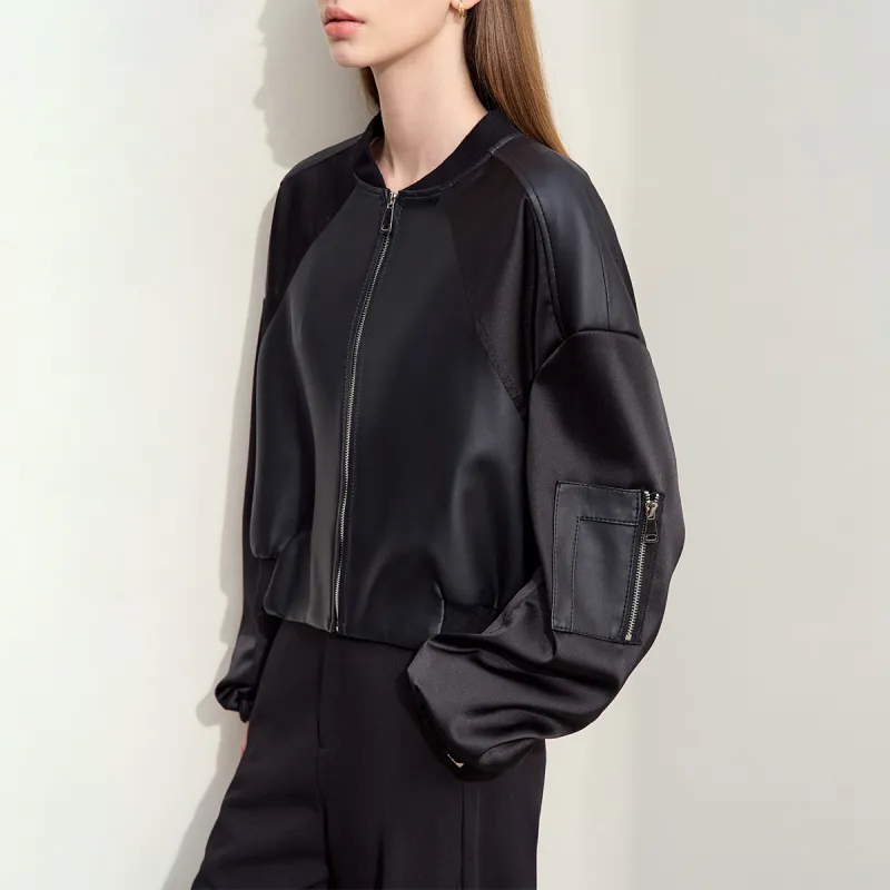 밑감: 51% 비스코스, 49% 폴리에스터 슬리브 패널: 98% 폴리에스터, 2% 스판덱스 안감: 100% 폴리에스터