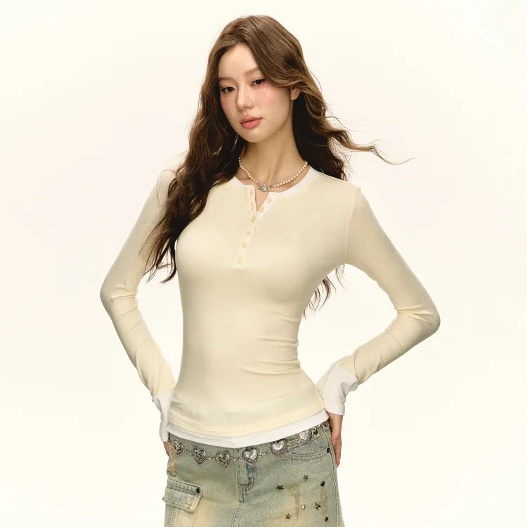 Ariseism 디자인 Focused 헨리 카라 레이어드 룩 긴팔 티셔츠 여성용, 가을 슬림핏 상의 여성