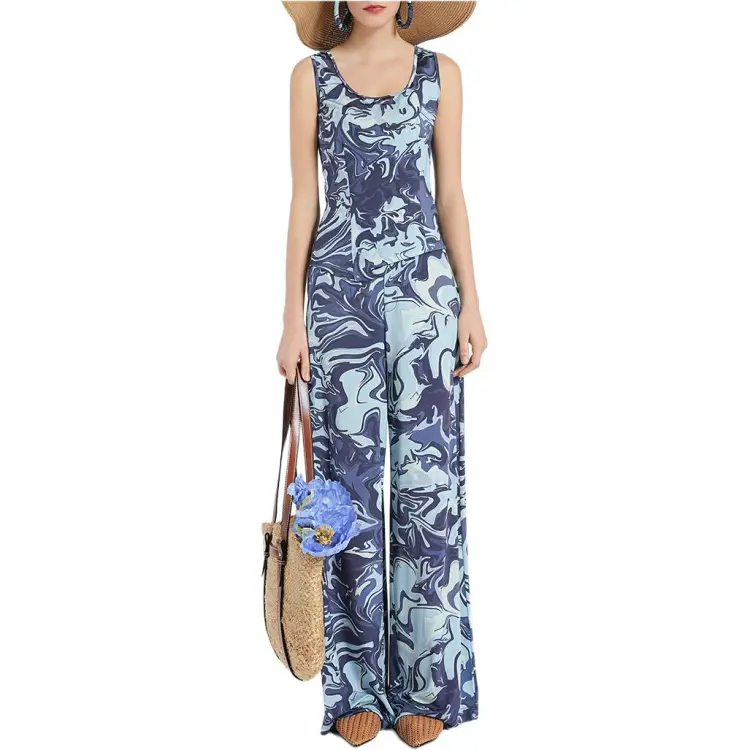 BESIONIA 블루 패턴 여성 캐주얼 팬츠