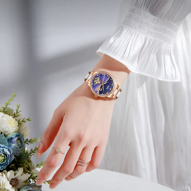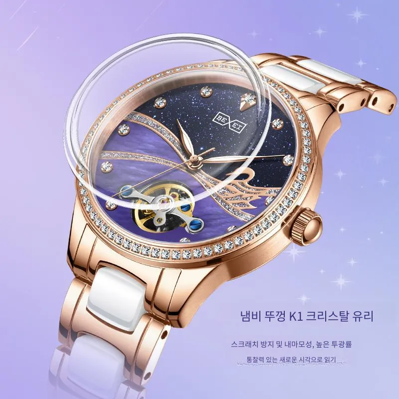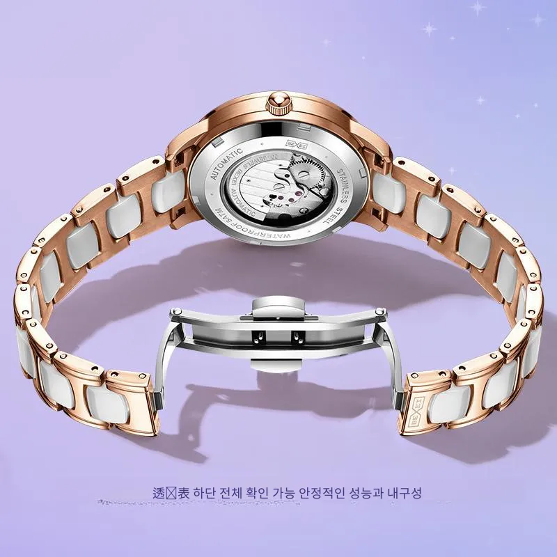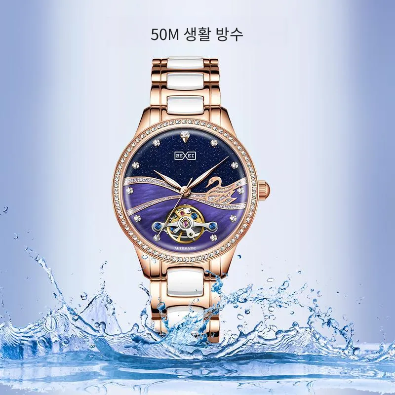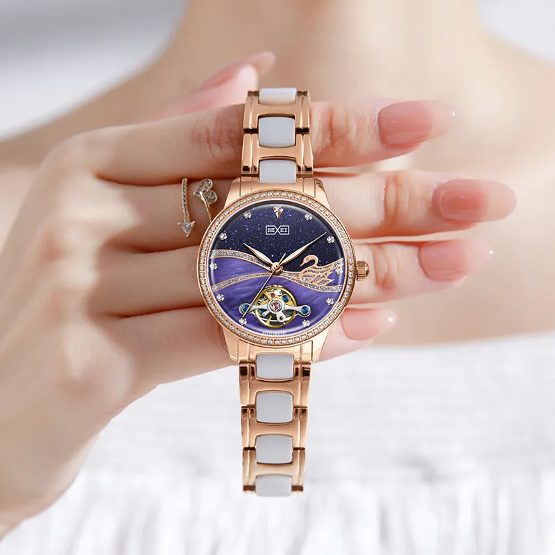 BEXEI 스완 컬렉션 메커니컬 무브먼트 세라믹 스트랩 중국 시계 여성 시계 퍼플 시계 다이얼