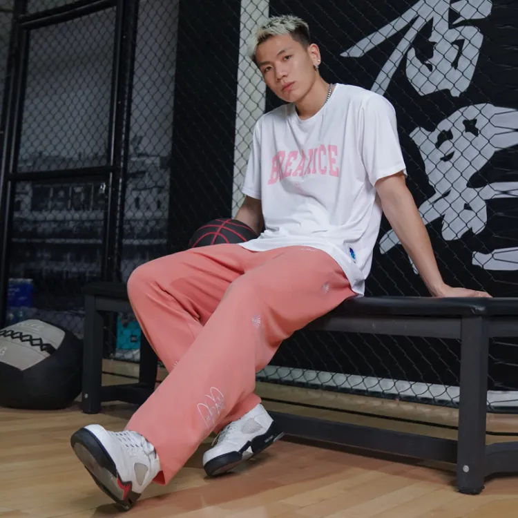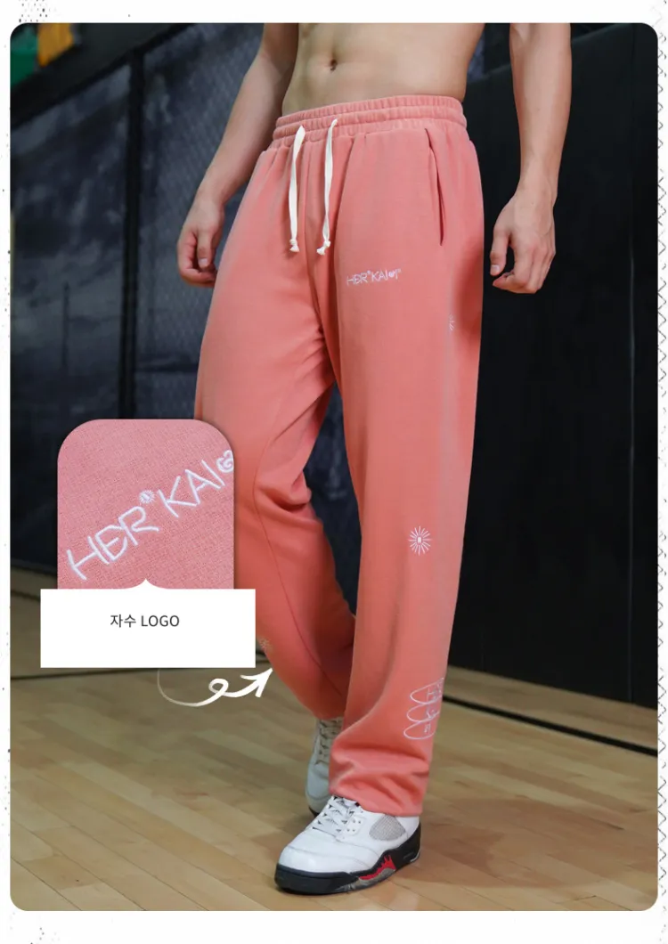 블랙 바지 핑크 자수 로고