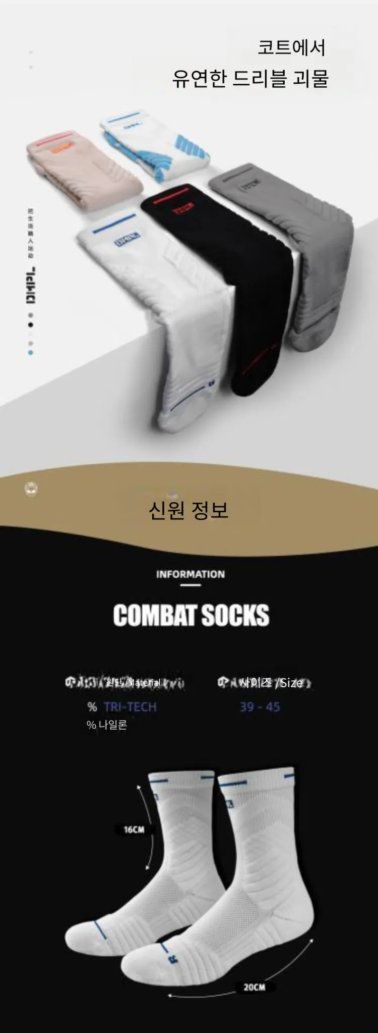 발등: 87.3% 폴리아미드, 6.7% 폴리에스터, 3.2% 스판덱스, 1.8% 면 발끝: 47.1% 폴리에스터, 38.3% 폴리아미드, 11.5% 면, 3.1% 스판덱스