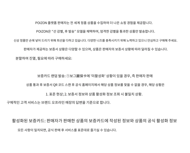 사이버몰 내 판매되는 상품 중에는 POIZON Holding Pte. Ltd.에 등록한 판매자가 판매하는 마켓플레이스(오픈마켓) 상품이 포함되어 있습니다. 마켓플레이스(오픈마켓) 상품의 경우 POIZON Holding Pte. Ltd.는 통신판매중개자이며, 통신판매의 당사자가 아닙니다. POIZON Holding Pte. Ltd.는 마켓플레이스(오픈마켓) 상품, 거래정보 및 거래 등에 대하여 책임을 지지 않습니다.
