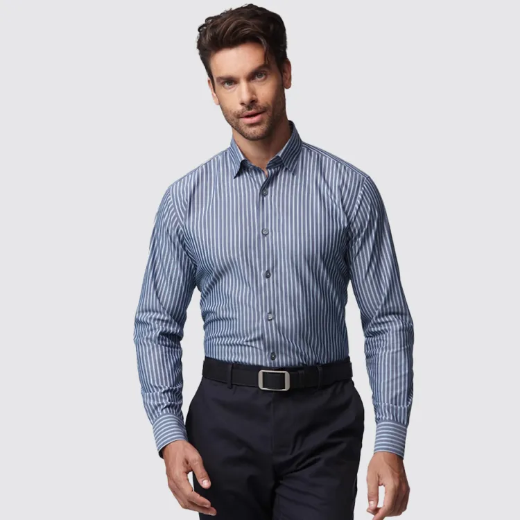 색상:그레이 블루 스트라이프 패턴, 히든 버튼 칼라
