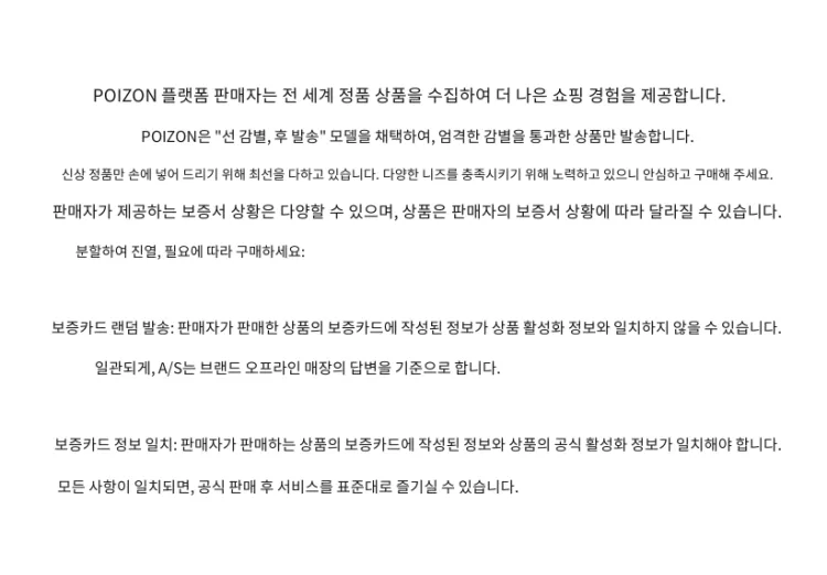 사이버몰 내 판매되는 상품 중에는 POIZON Holding Pte. Ltd.에 등록한 판매자가 판매하는 마켓플레이스(오픈마켓) 상품이 포함되어 있습니다. 마켓플레이스(오픈마켓) 상품의 경우 POIZON Holding Pte. Ltd.는 통신판매중개자이며, 통신판매의 당사자가 아닙니다. POIZON Holding Pte. Ltd.는 마켓플레이스(오픈마켓) 상품, 거래정보 및 거래 등에 대하여 책임을 지지 않습니다.