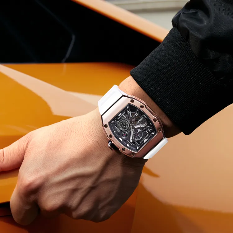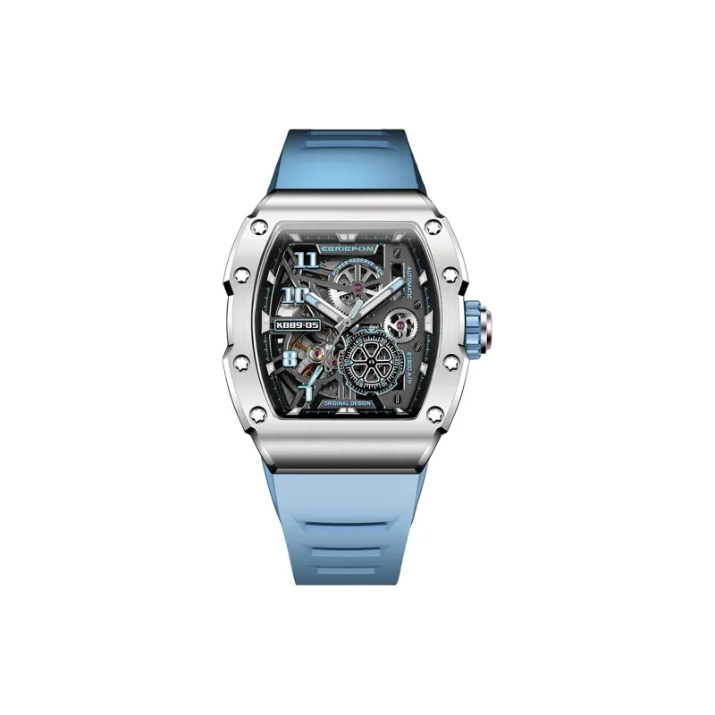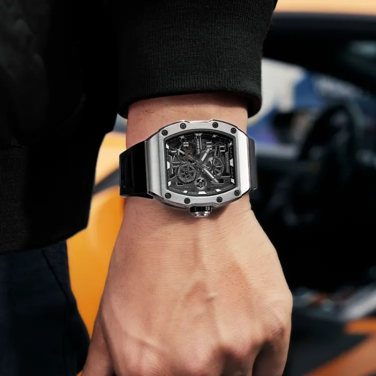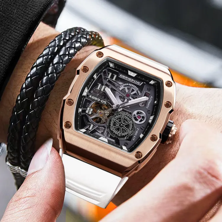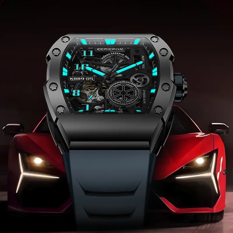 CERIEPON 실버 스톤 레이싱 컬렉션 컷아웃 학생 남성 시계 메커니컬 무브먼트 고무 스트랩 중국 시계 남성용 시계 블랙 다이얼