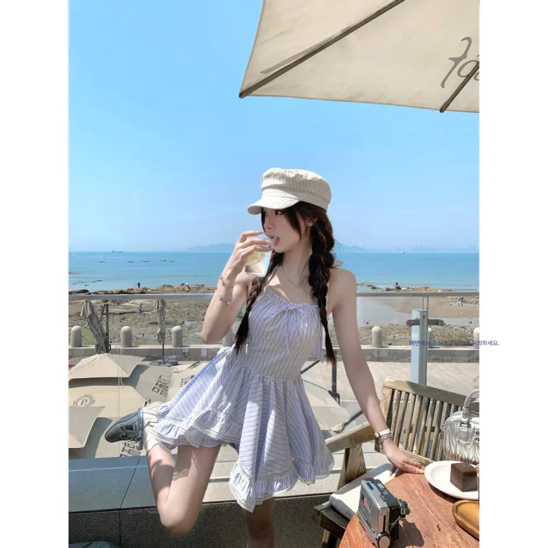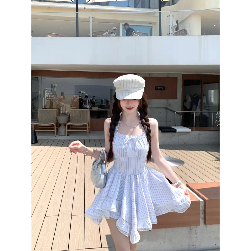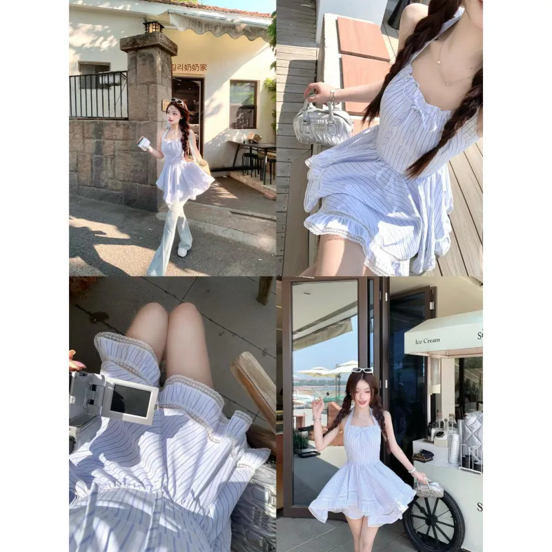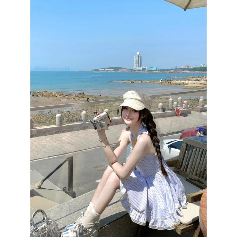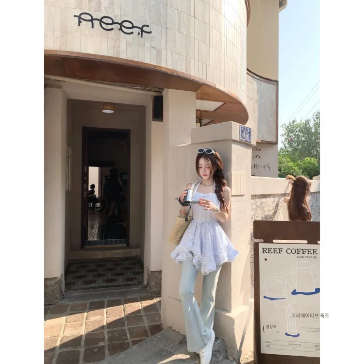 블루 화이트 스트라이프 연꽃 리프 홀터 상의