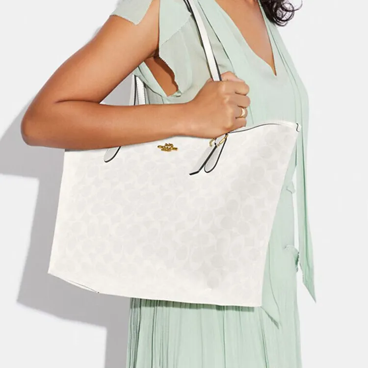 코치 도시 생활/여행/통근 캔버스+가죽 토트 가방, 쇼핑백, 핸드백, 숄더 백 L 여성 골드 & 초크 & 글래시어 화이트 - POIZON