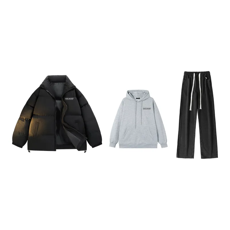 세트:블랙 패디드 재킷 + 라이트 그레이 + 블랙 바지