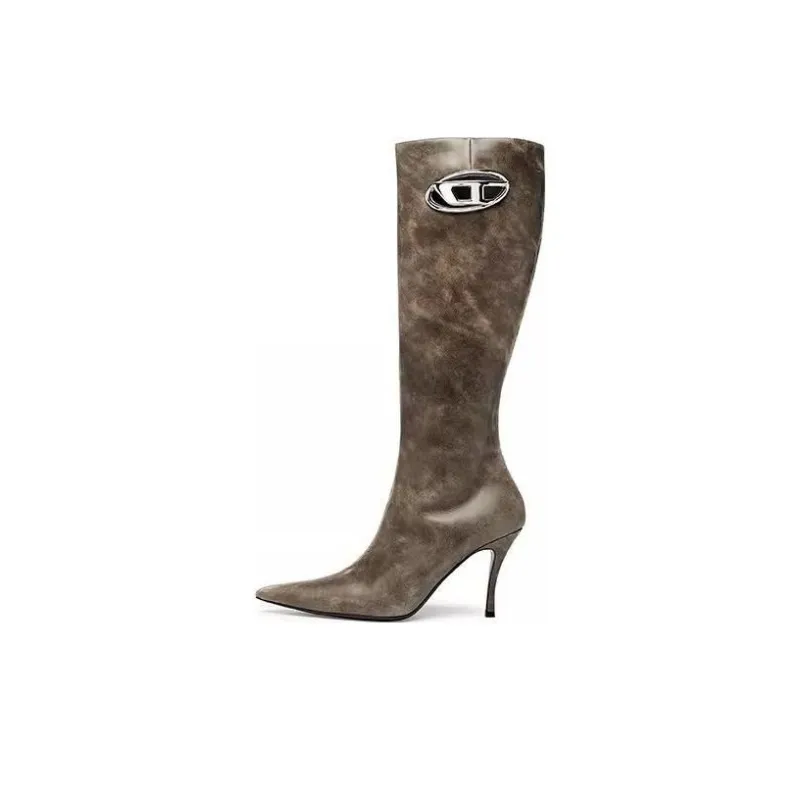디젤 DIESEL 타원형 D 시리즈 니하이 부츠 8CM 여성 그레이 - POIZON