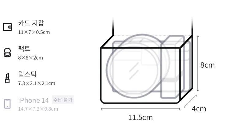 이어폰, 열쇠, 신분증을 보관할 수 있는 카드 지갑입니다. 출근 시 사용하기에 적합한 작은 사이즈로, 간편하게 휴대할 수 있습니다. 체인을 추가하면 크로스백으로도 활용 가능하며, 여름철에는 원피스와 매치하기에도 잘 어울립니다.