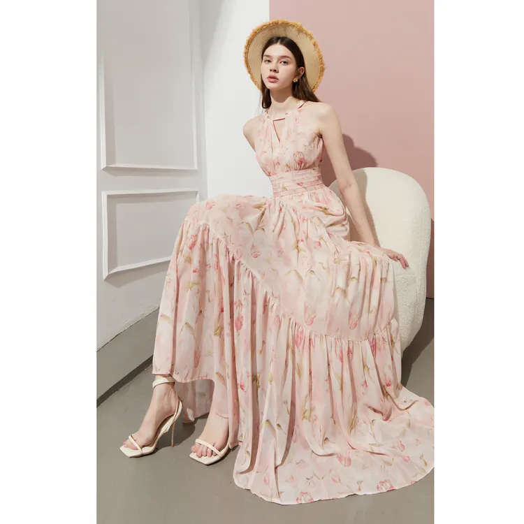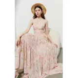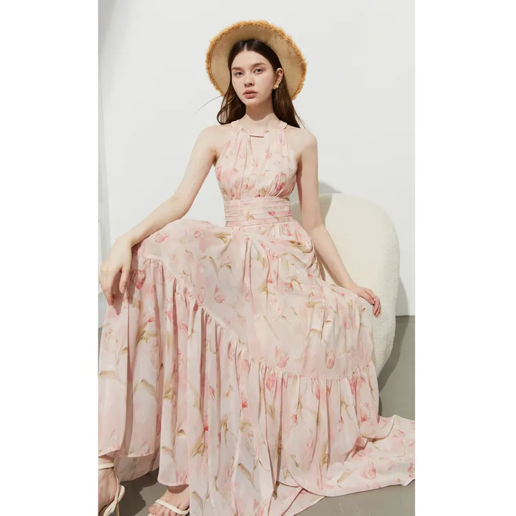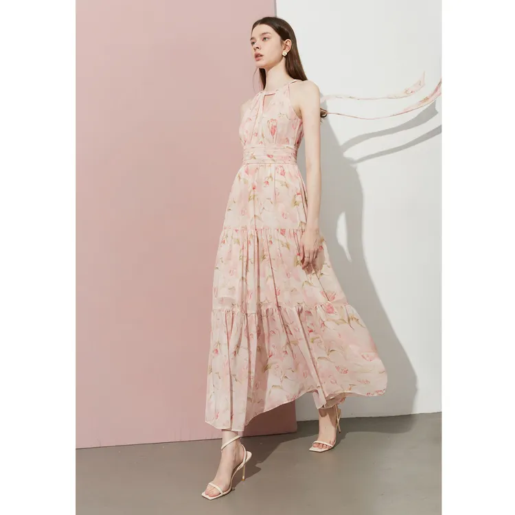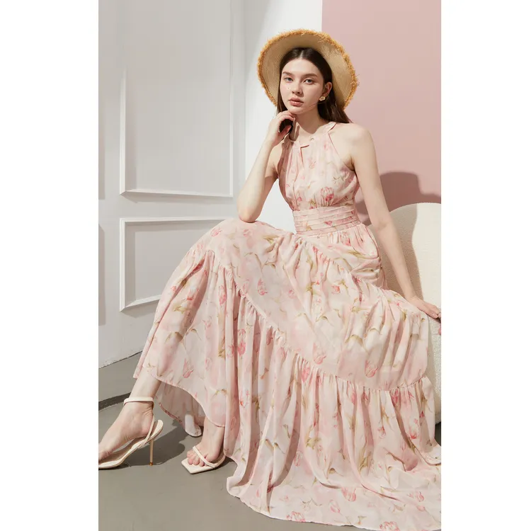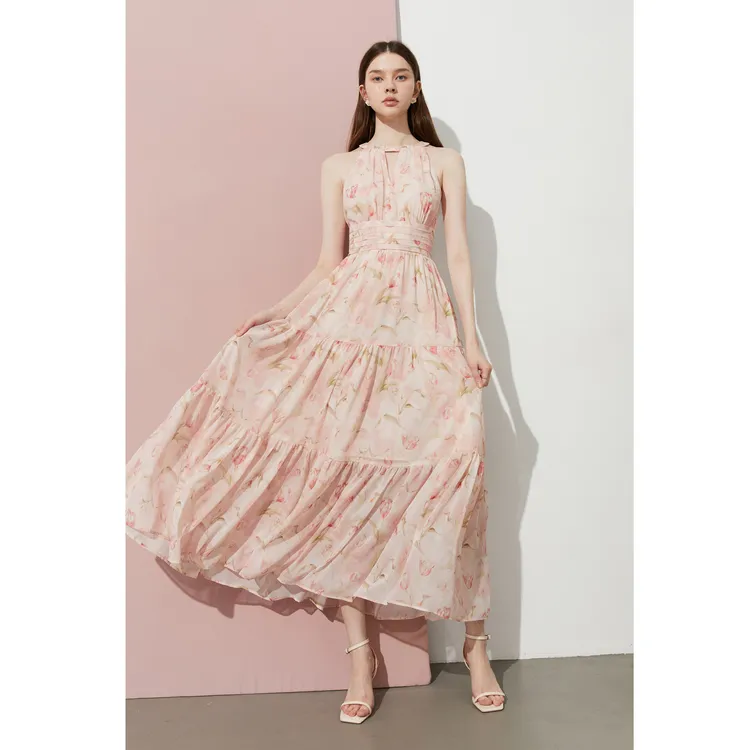 DPLAY 허니 파우더 튤립 여성 긴팔 원피스
