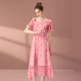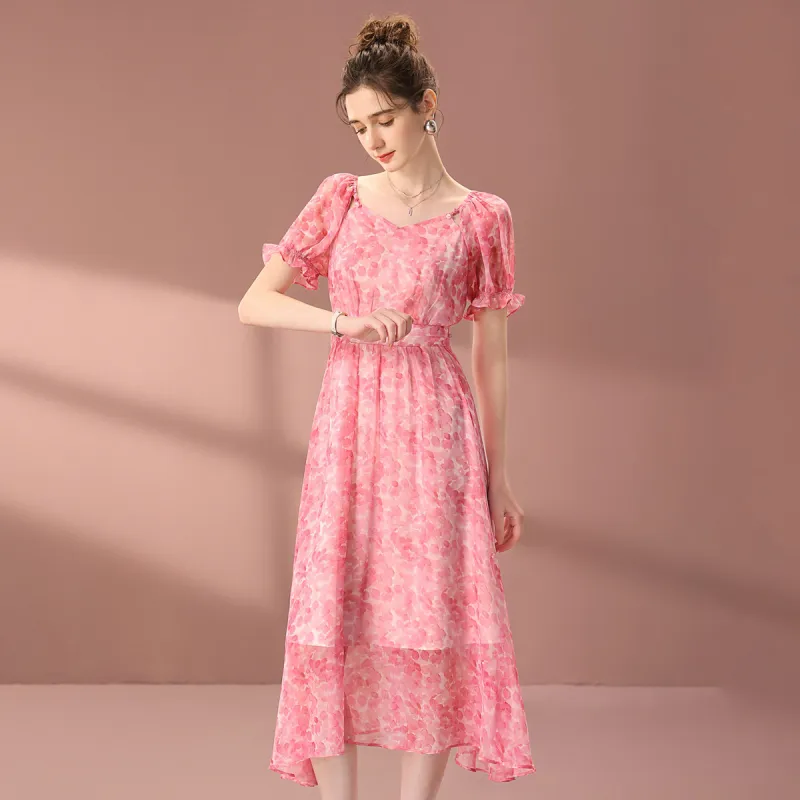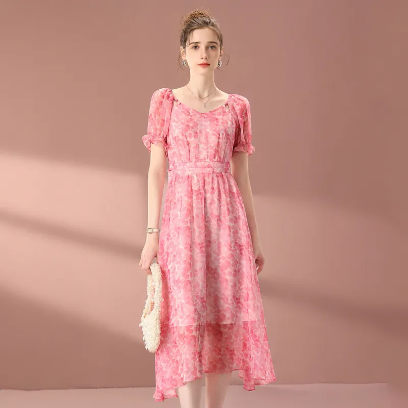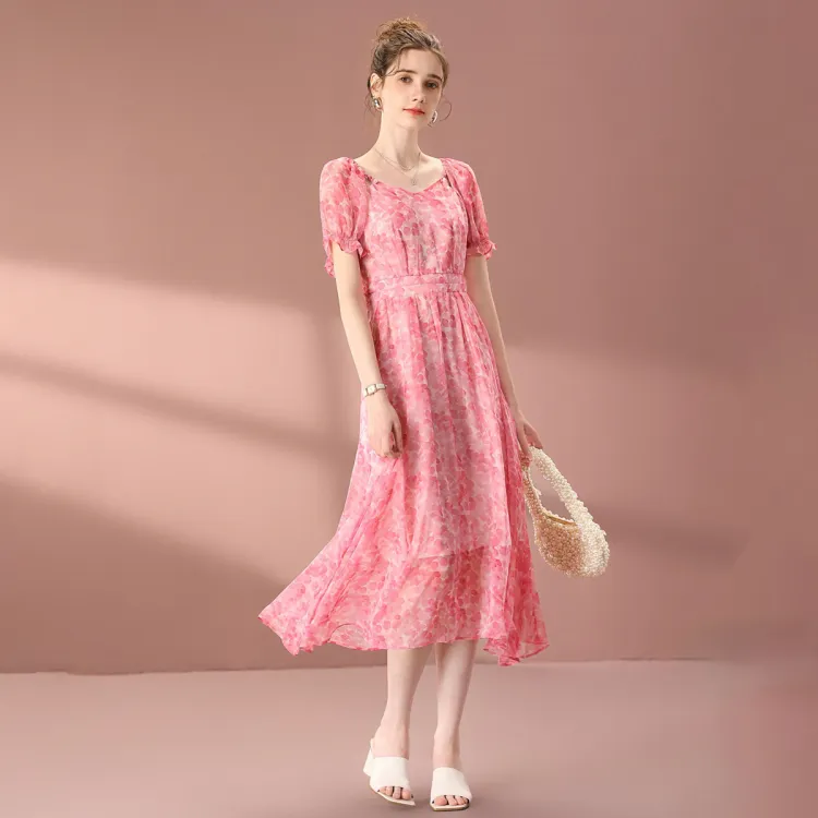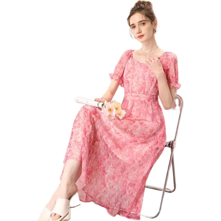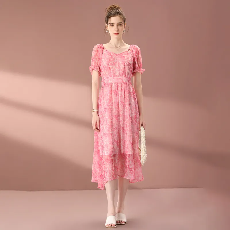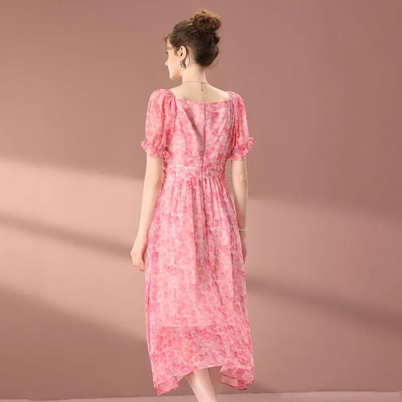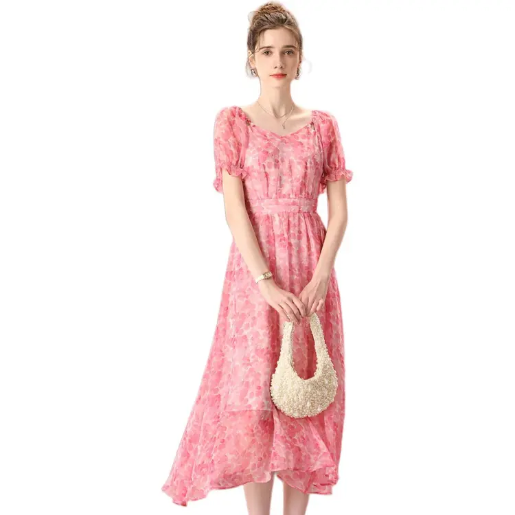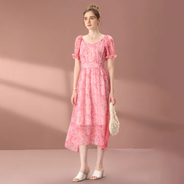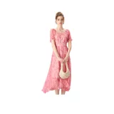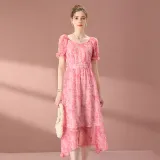 FENHONGMALI 2025 여름 컬렉션 반팔 원피스 여성 핑크