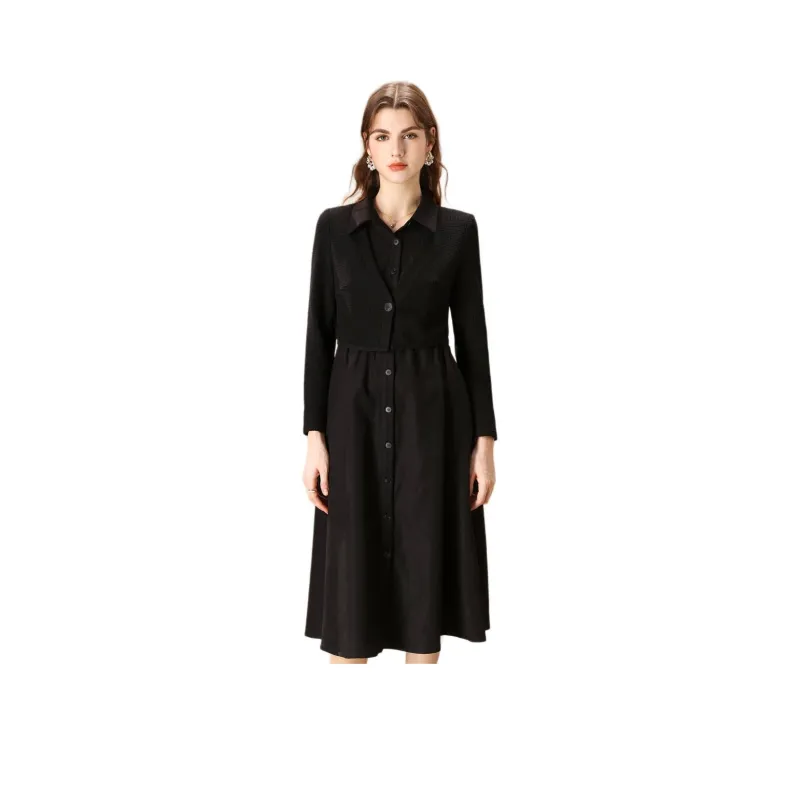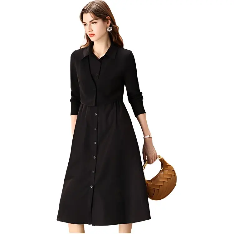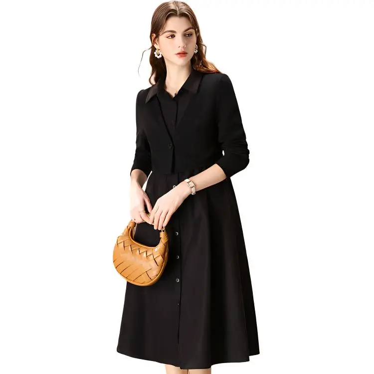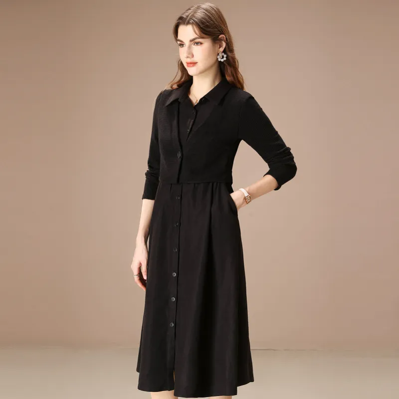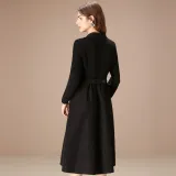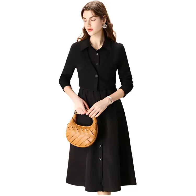 FENHONGMALI 블랙 여성 긴팔 원피스