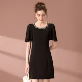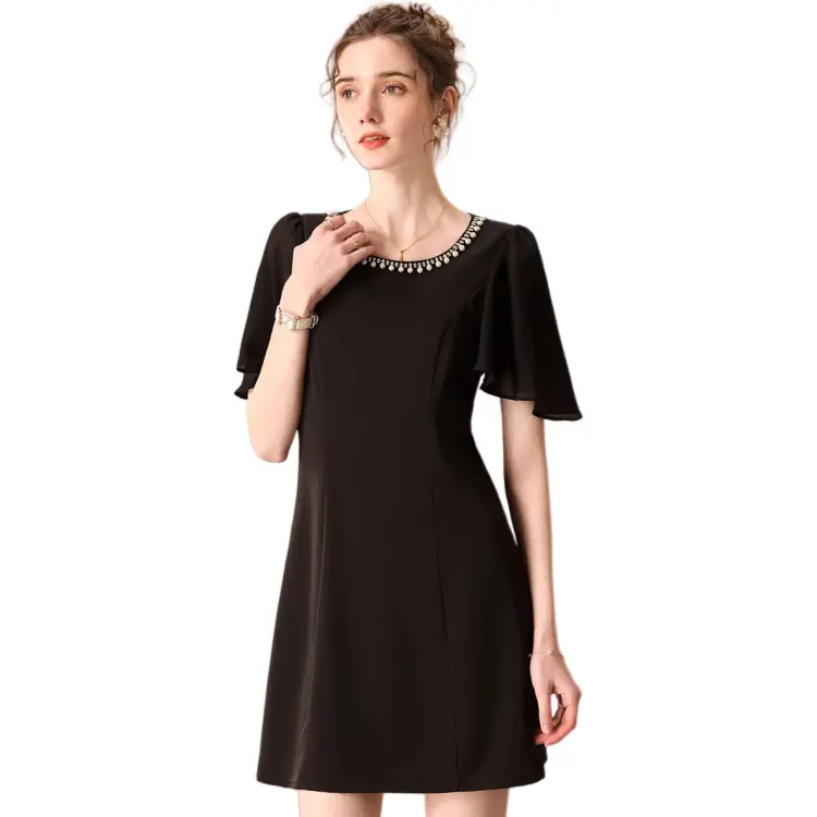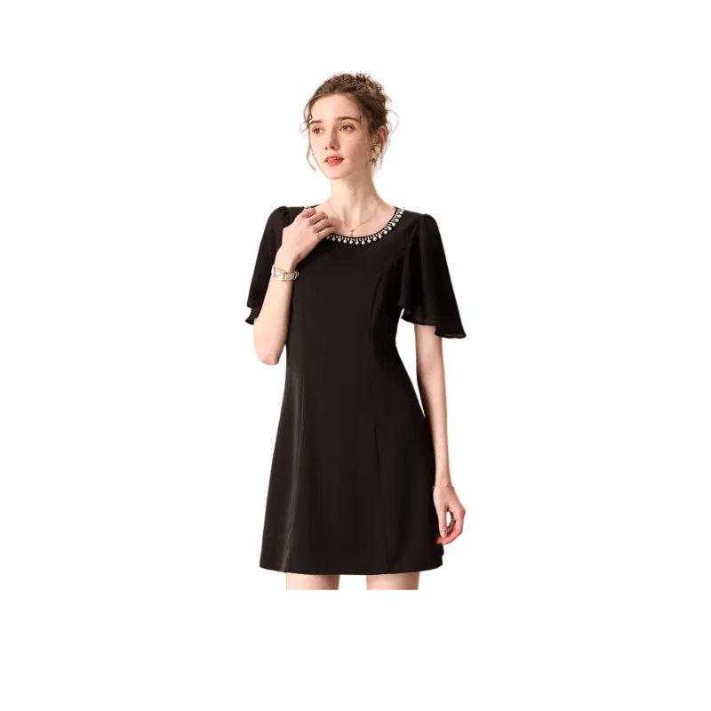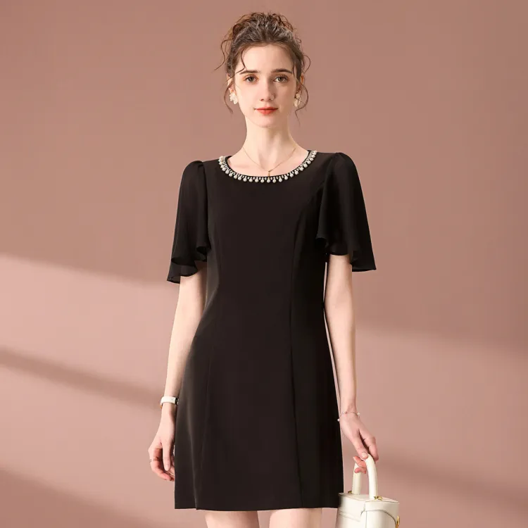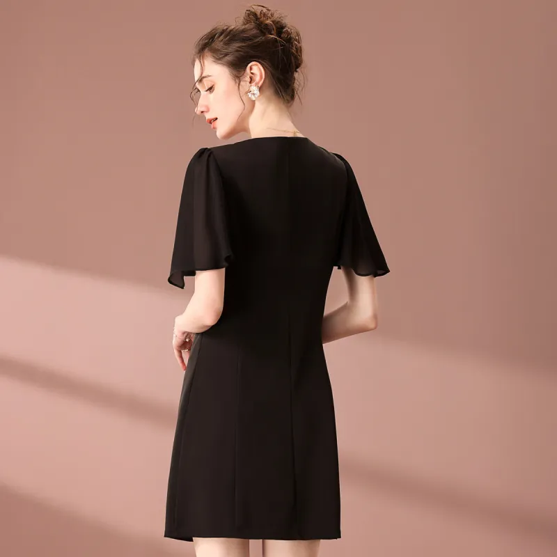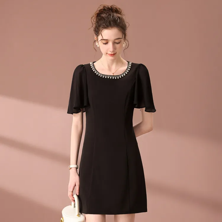 FENHONGMALI 블랙 여성 반팔 원피스