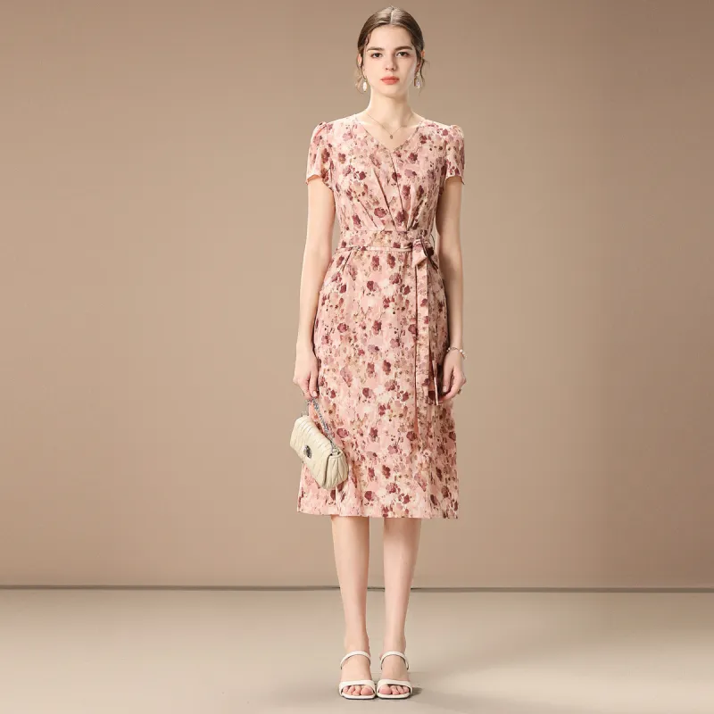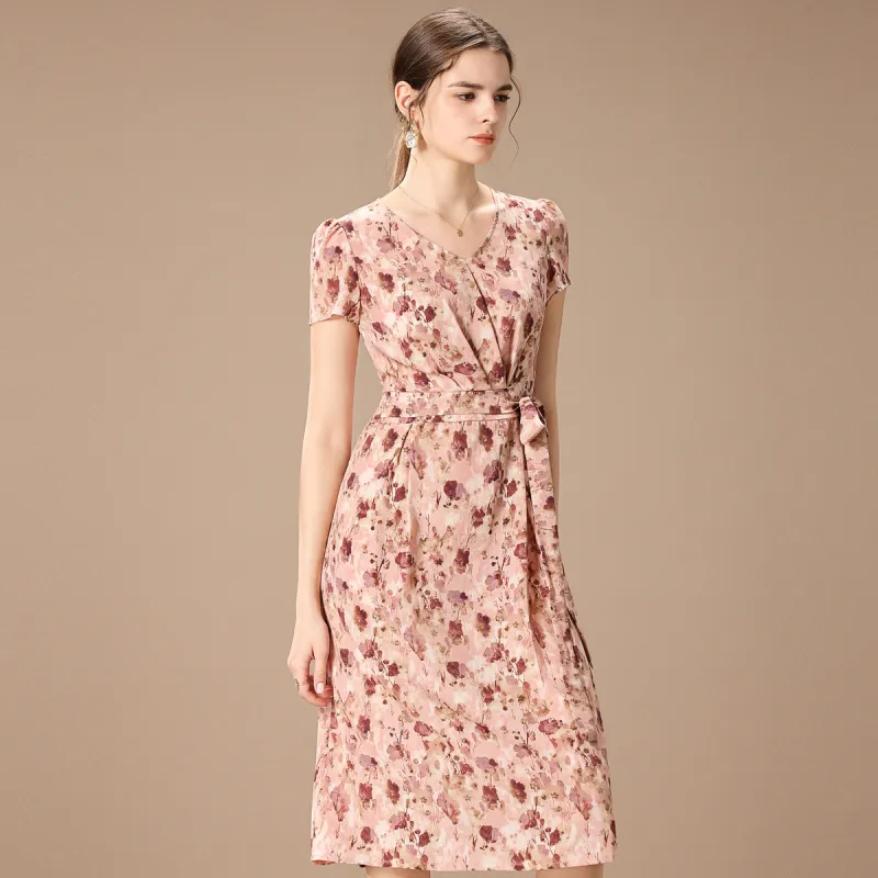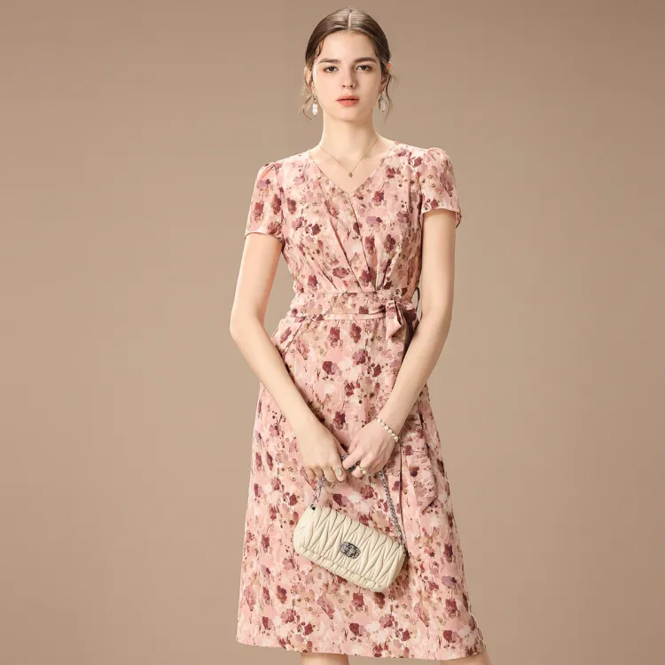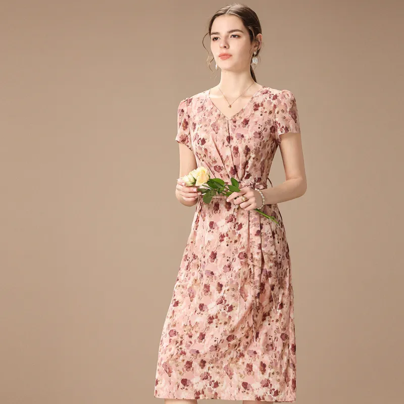 FENHONGMALI 핑크 플로럴 여성 반팔 원피스