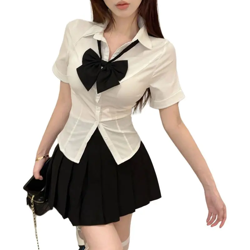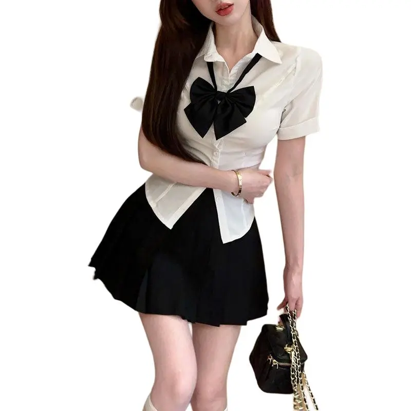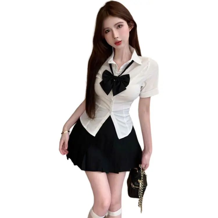 세트:화이트 블라우스와 나비 넥타이, 블랙 플리츠 스커트