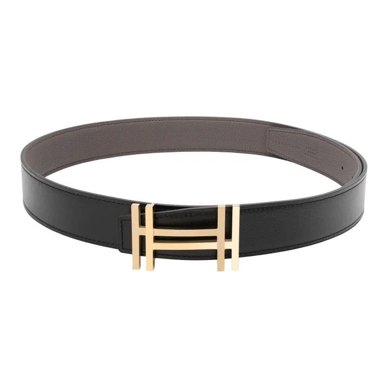 HERMES 더블 H 블록 골드 버클 토고 송아지 가죽 양면 가죽 벨트 남성 블랙/틴 그레이 너비 3.2cm