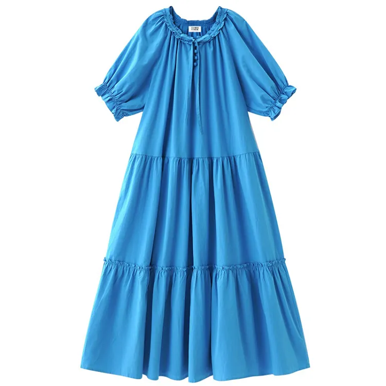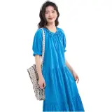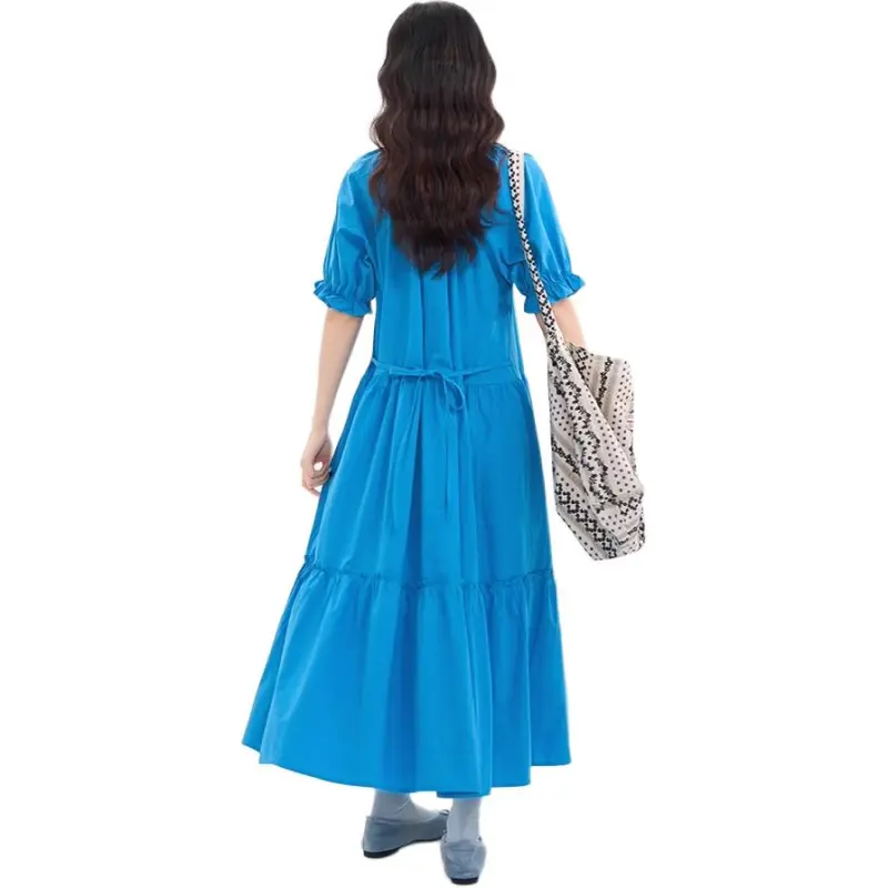 HTMEME 빈티지 블루 여성 반팔 원피스 - POIZON