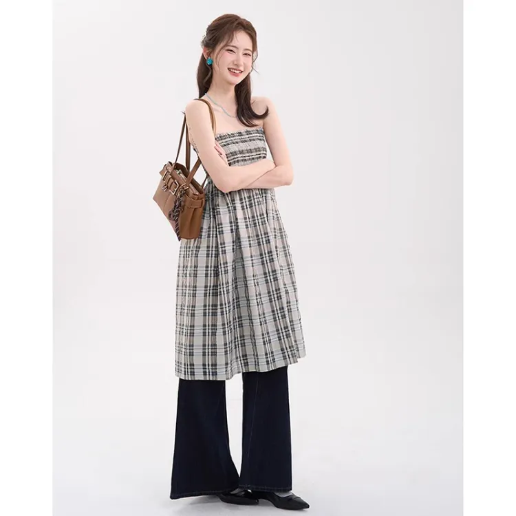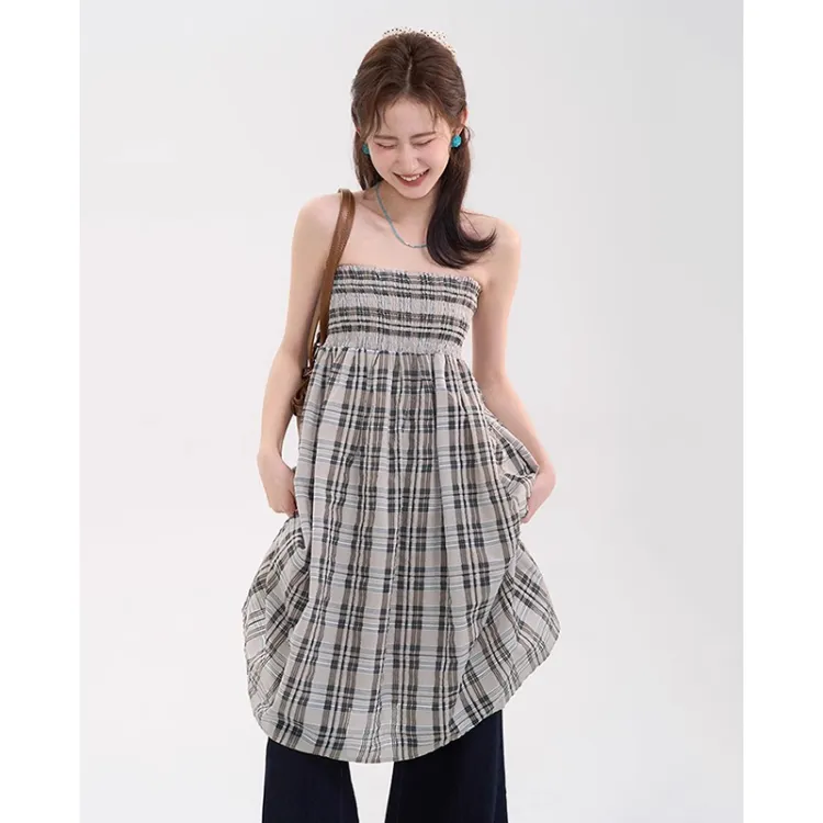 HTMEME 그레이 체크 여성 민소매 원피스 - POIZON
