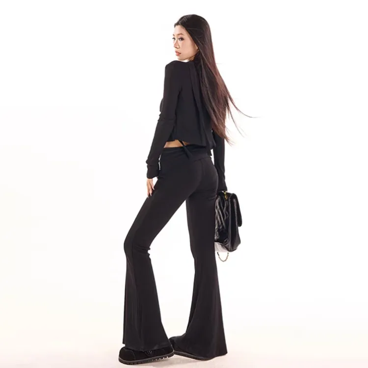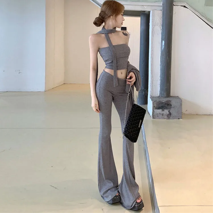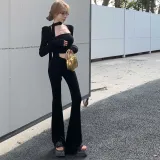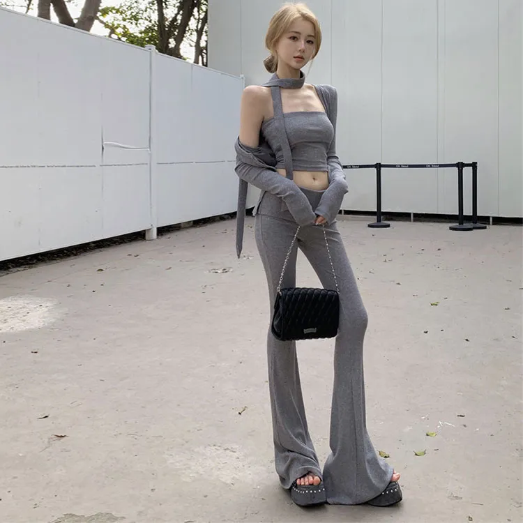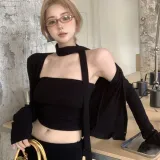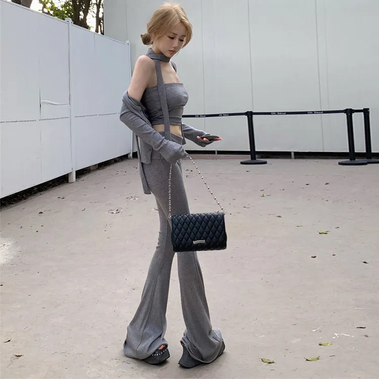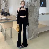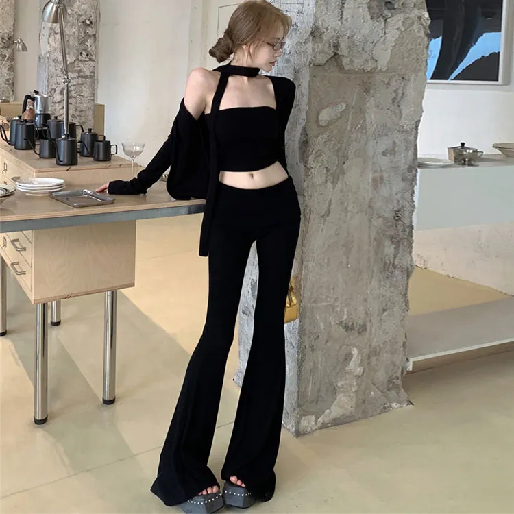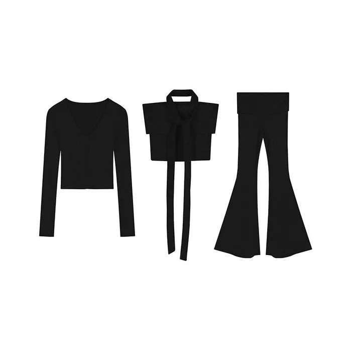 세트:블랙 가디건 + 오프숄더 상의 + 바지