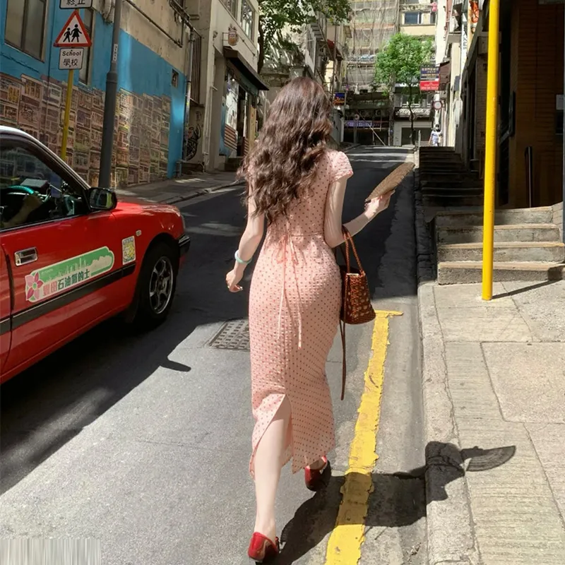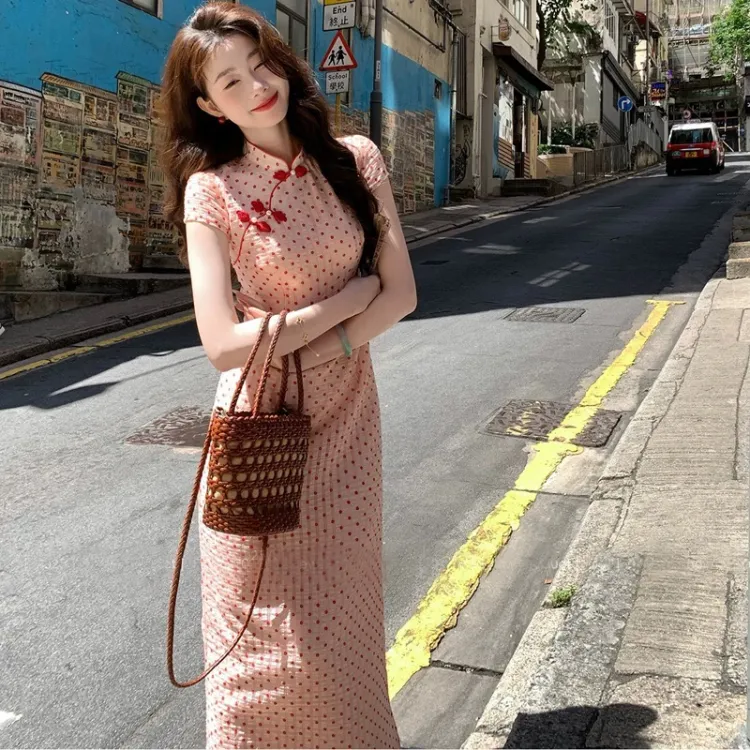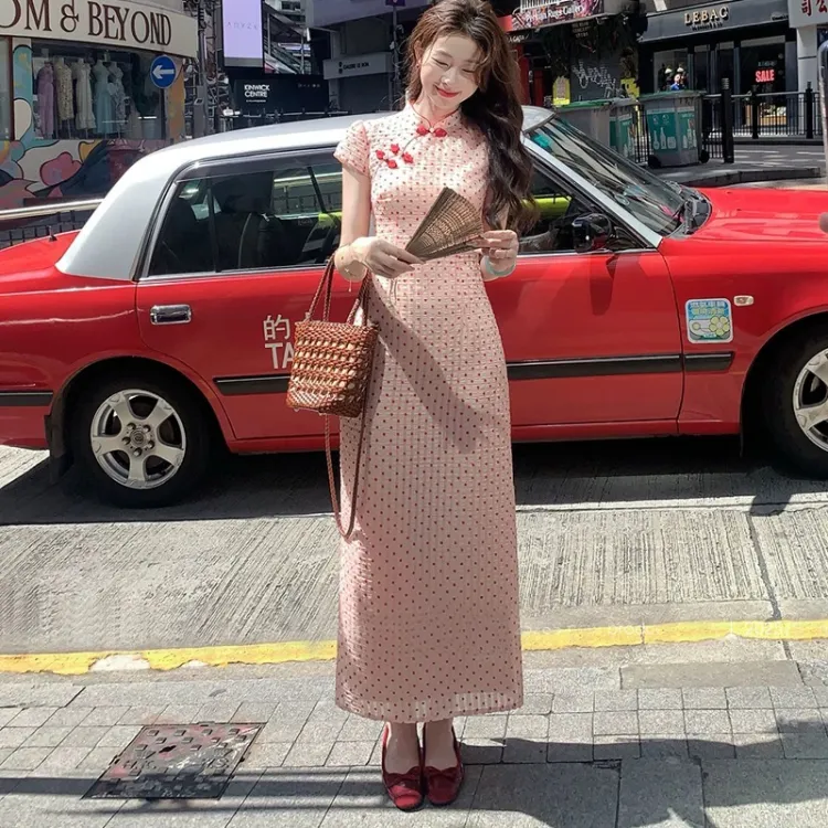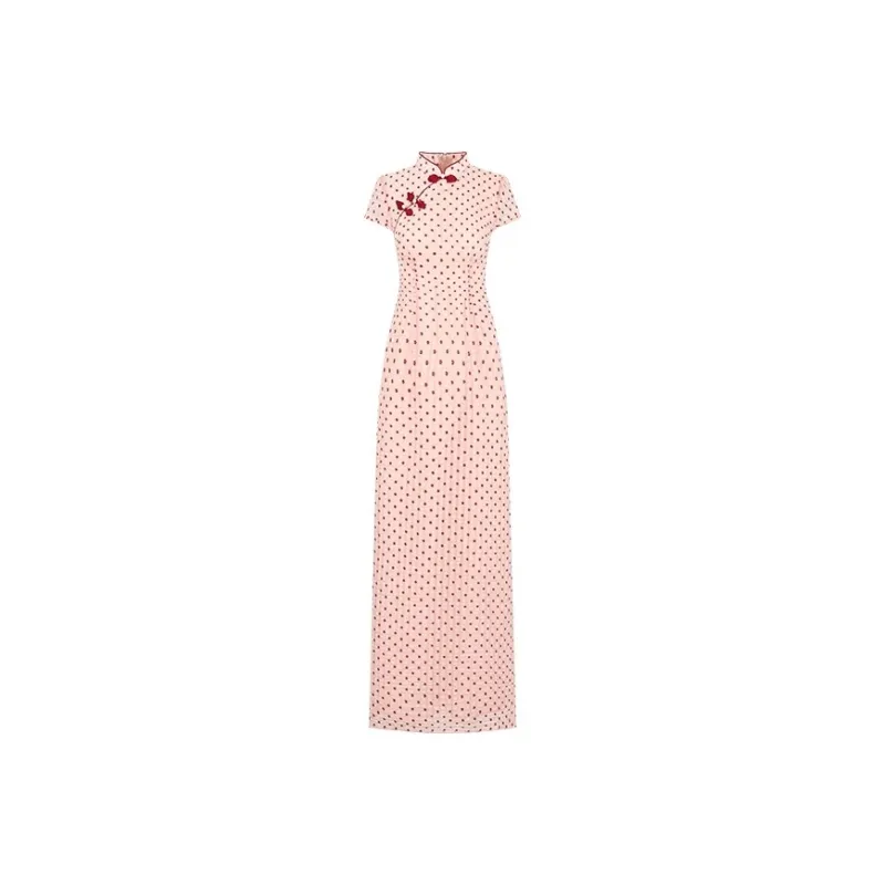 INCO VIBE 핑크 치파오 드레스 여성 반팔 원피스 - POIZON
