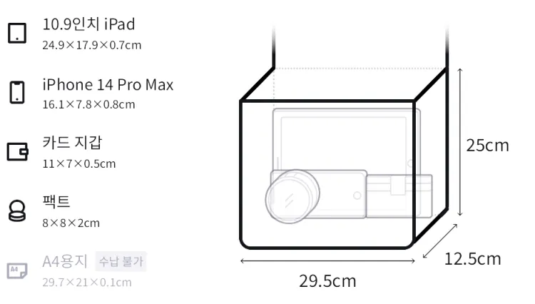 길이: 36.5/29.5cm, 넓이: 12.5cm, 추천 신장: 25cm