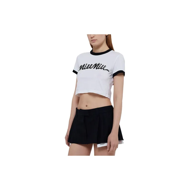 (W) 미우 미우 코튼 저지 티셔츠 프린티드 로고 화이트 블랙 - POIZON
