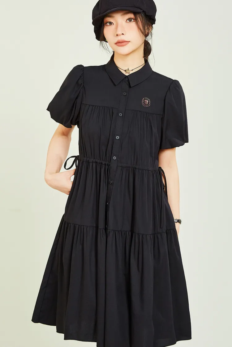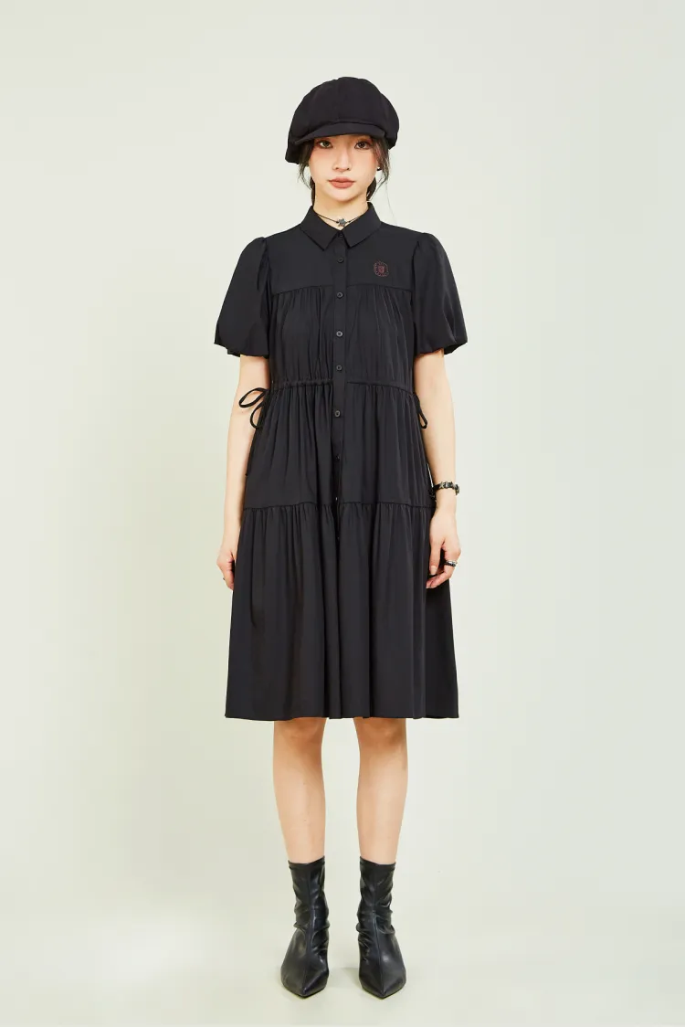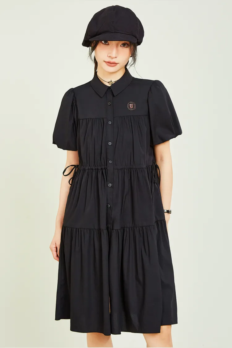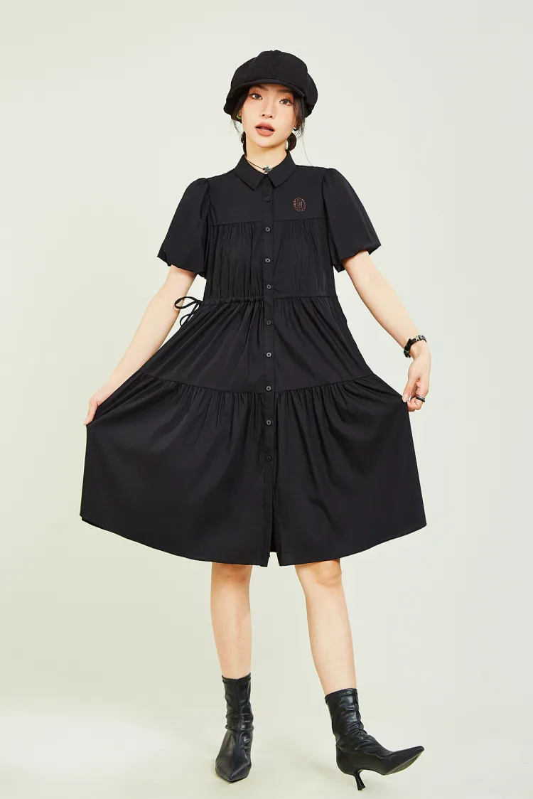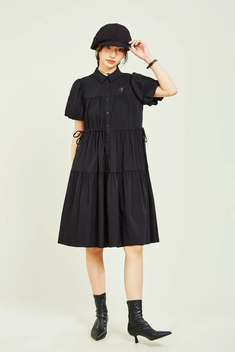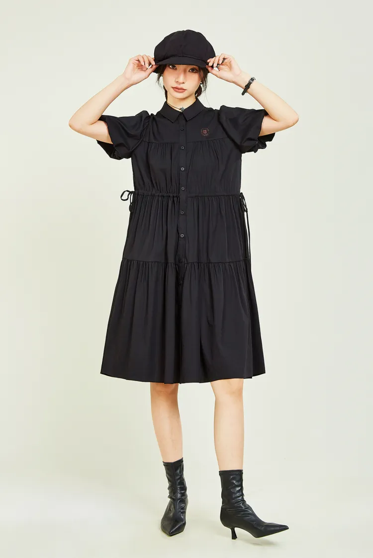 MUGUOGUOMU 여름 반팔 원피스 허리 셔링 여성 블랙