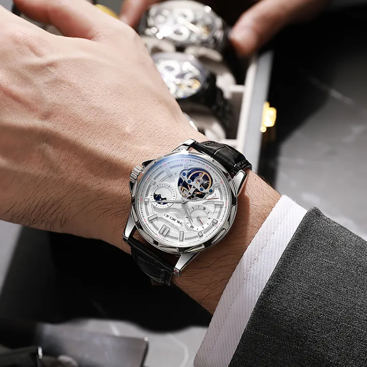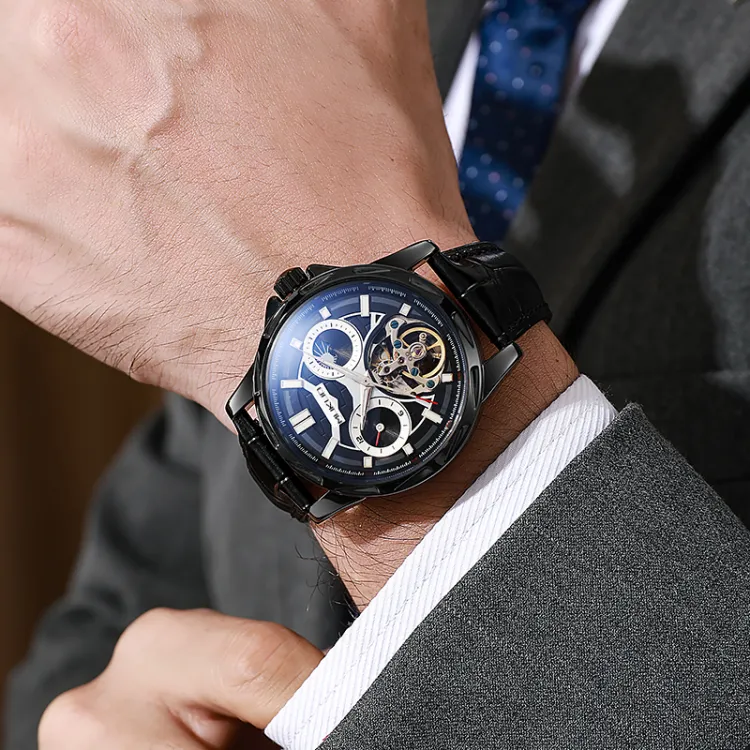 MUKUO 익스플로러 컬렉션 글로우 인 더 깊이 방수 패션 활용도 높은 오토매틱 메커니컬 무브먼트 천연 가죽 스트랩 중국 시계 남성용 시계 블랙 다이얼 - POIZON
