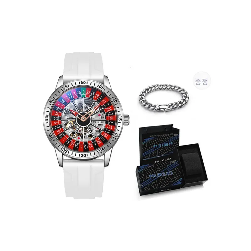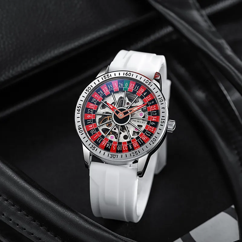MUKUO 쿨 플레이 컬렉션 로테이팅 개성 있는 울트라 니치 와 내추럴 프레젠스 오토매틱 메커니컬 무브먼트 실리콘 스트랩 중국 시계 남성용 시계 레드 시계 다이얼