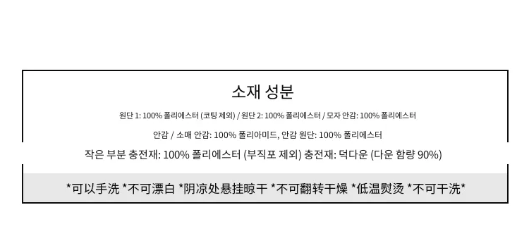 원단 1: 100% 폴리에스터 원단 2/모자 안감: 100% 폴리에스터 안감 소매 안감: 100% 폴리아미드 안감 주요 소재/겉감: 100% 폴리에스터