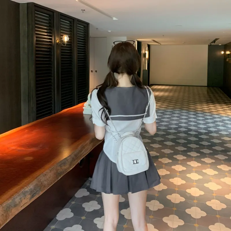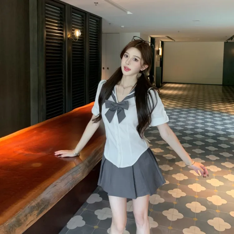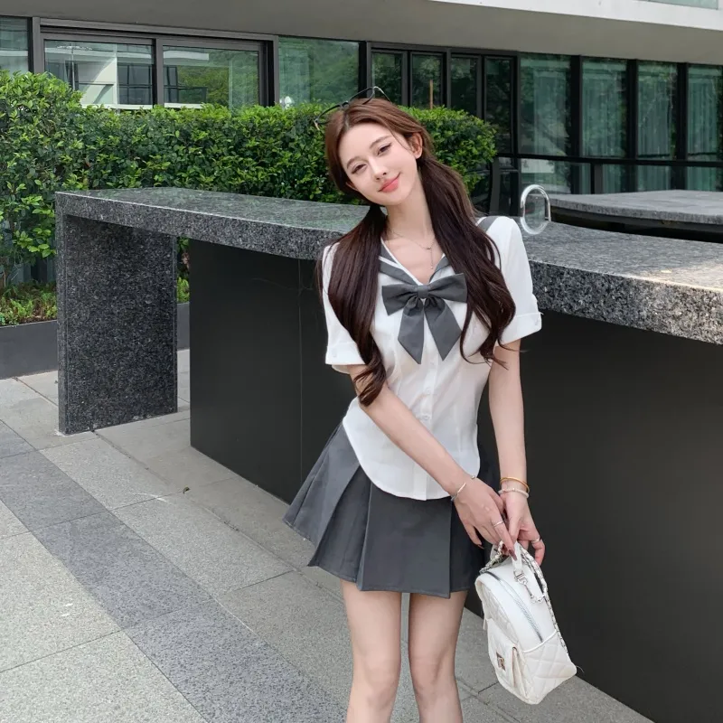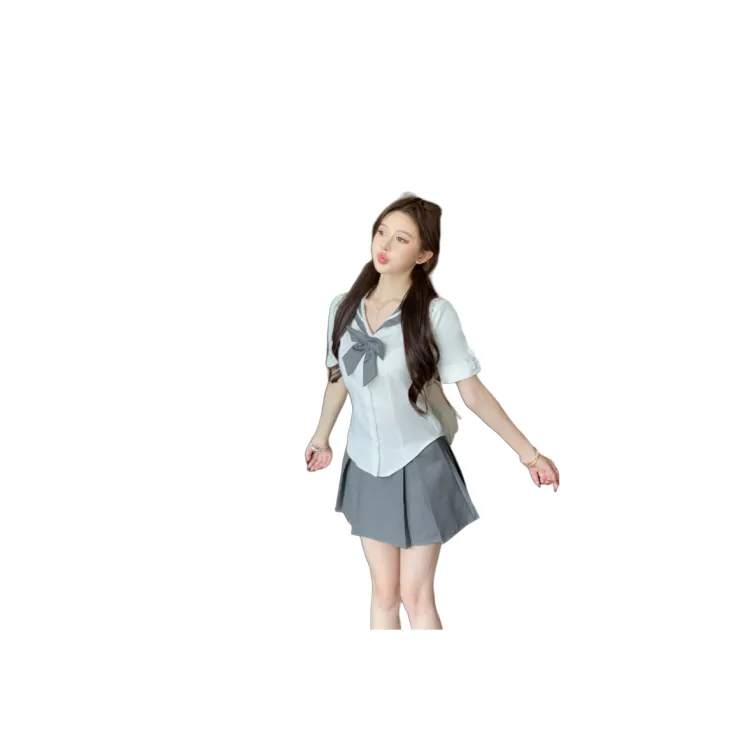 ONNFB 화이트 블라우스 + 그레이 플리츠 스커트 여성 유니폼 - POIZON