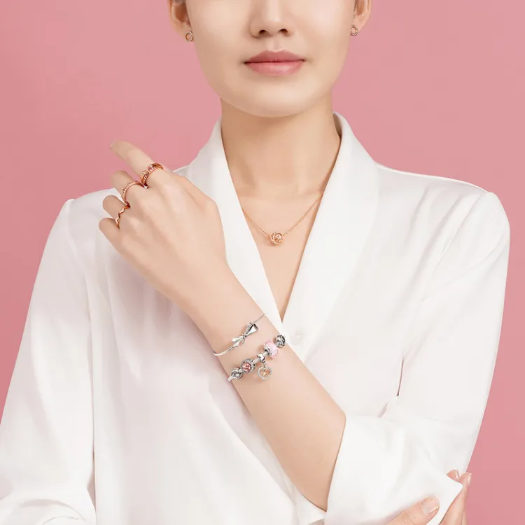 (W) 판도라 스파클링 크라운 링 핑크 로즈 골드 플래팅 핑크 - POIZON