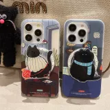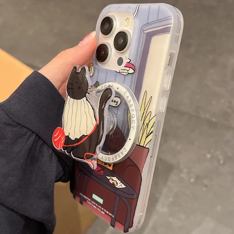 마그네틱 브라운 소파 블랙 고양이 폰 케이스 + 레드 폼폼 블랙 고양이 폰 스탠드