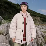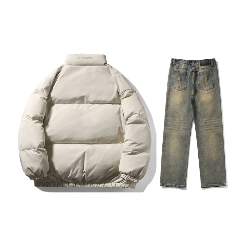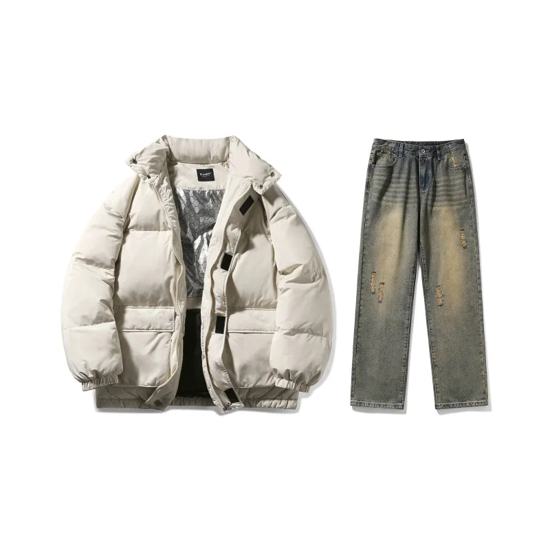 다운 재킷: 원단: 100% 폴리에스터, 안감: 100% 폴리에스터, 내피: 100% 폴리에스터 청바지: 94.8% 면, 3% 재생 셀룰로오스 섬유, 2.2% 기타 섬유