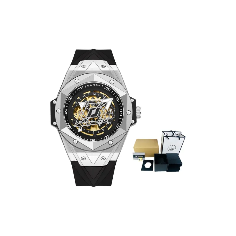 산다 오토매틱 메커니컬 무브먼트 실리콘 스트랩 중국 시계 남성용 시계 블랙 다이얼