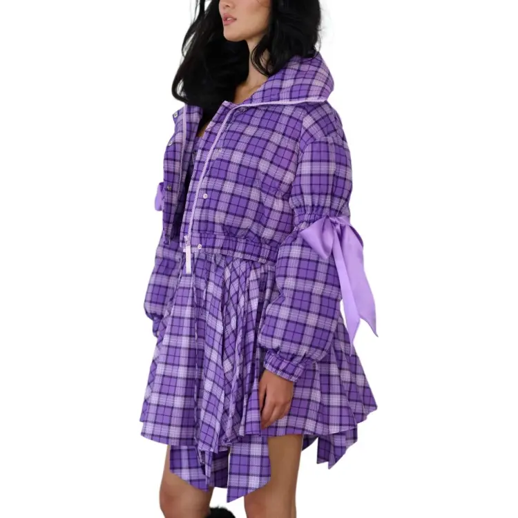 Selkie FW24 푸퍼 재킷 여성 퍼플 프레피 스타일 체크무늬 프린팅