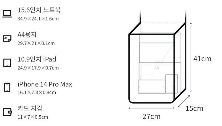 L27*W15*H41cm 수납 크기: 길이 27cm, 넓이 15cm, 추천 신장 41cm