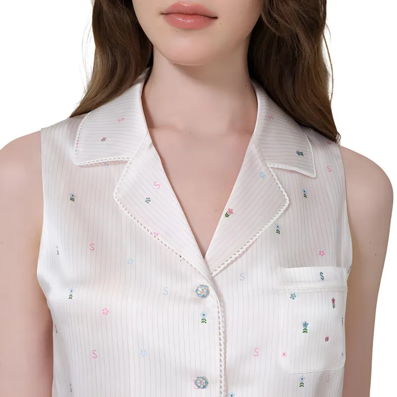 SILKY MIRACLE 핑크 스트라이프 패턴 작은 꽃 의류 세트 여성 파자마 세트