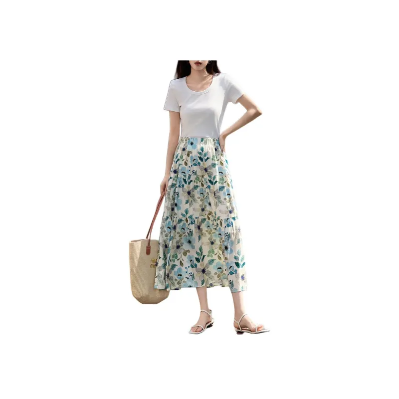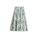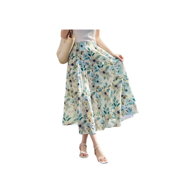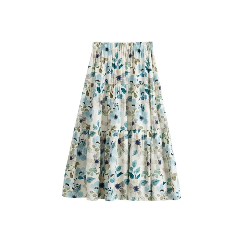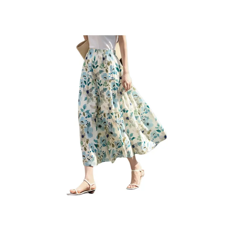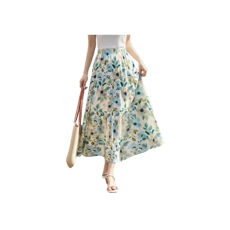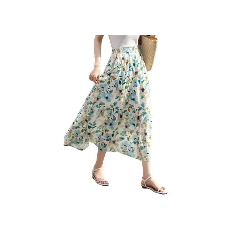 SLLSKY 애프리콧 와 블루 플로럴 여성 캐주얼 롱 스커트 - POIZON