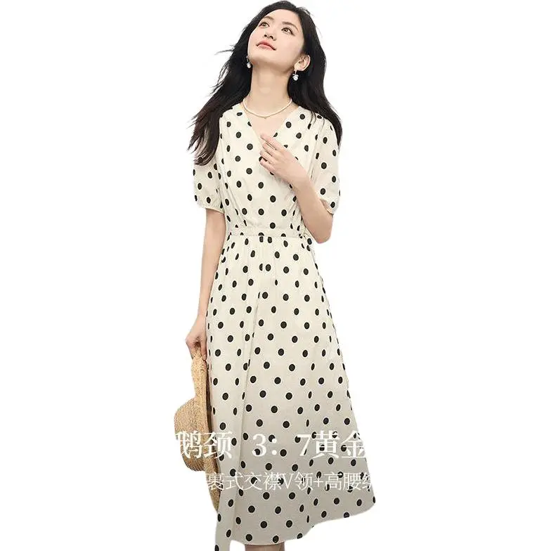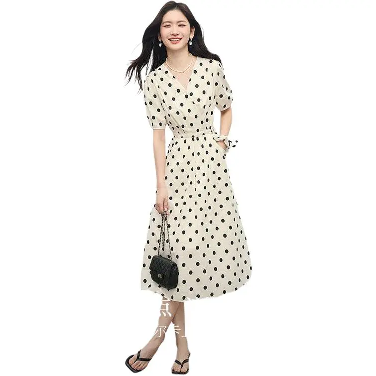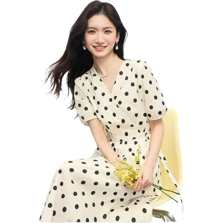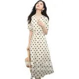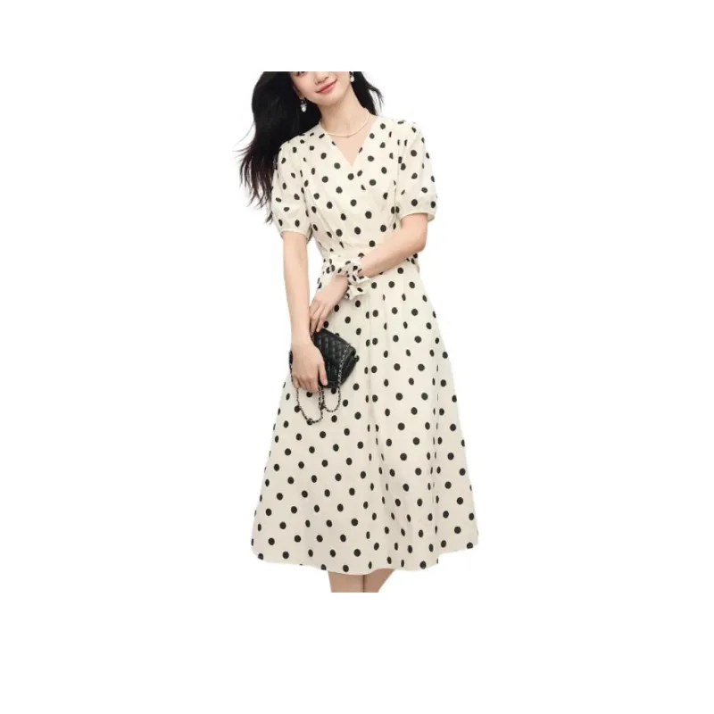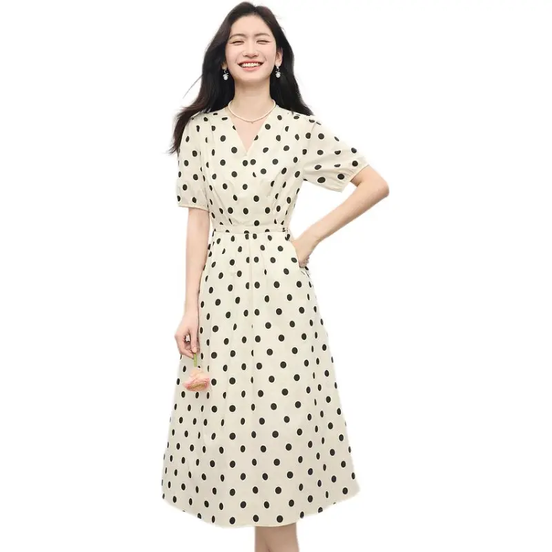 SLLSKY 애프리콧와 블랙 도트 무늬 여성 반팔 원피스 - POIZON
