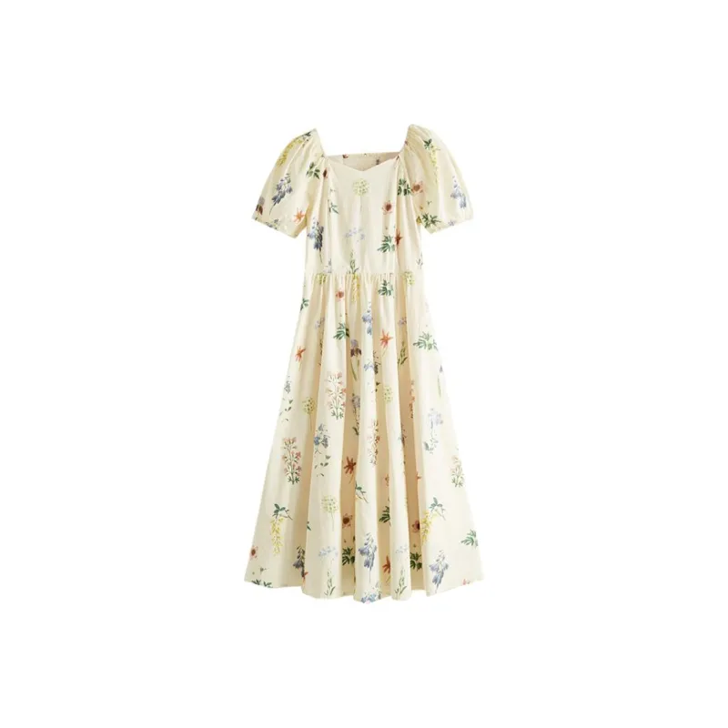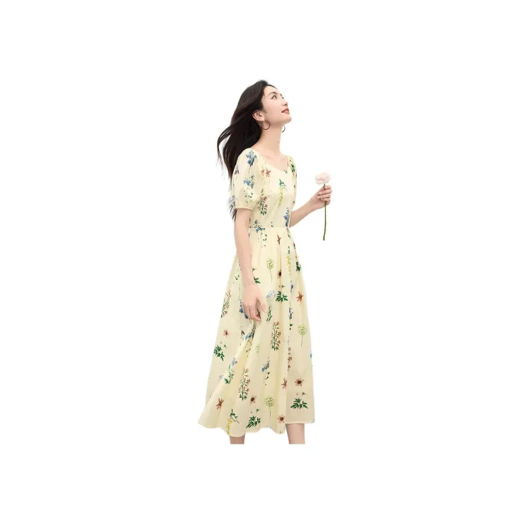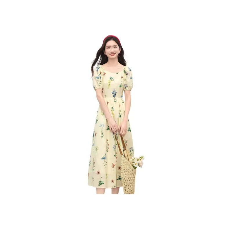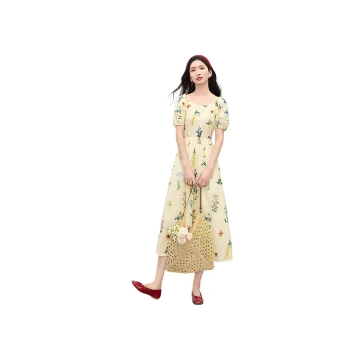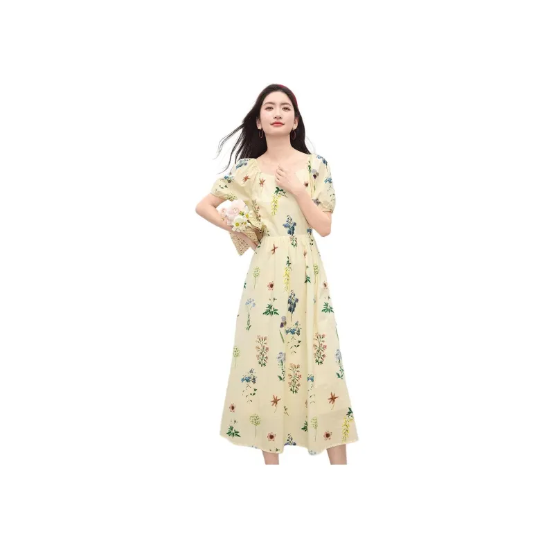 SLLSKY 애프리콧+플로럴 프린트 여성 반팔 원피스 - POIZON