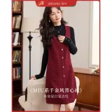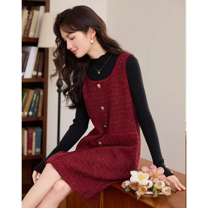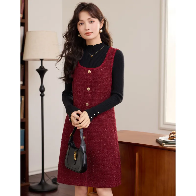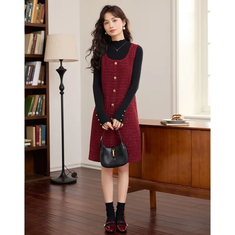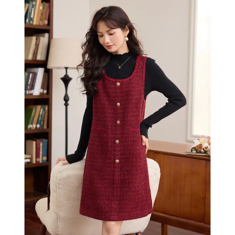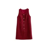 SLLSKY 빈티지 레드 여성 반팔 원피스 - POIZON